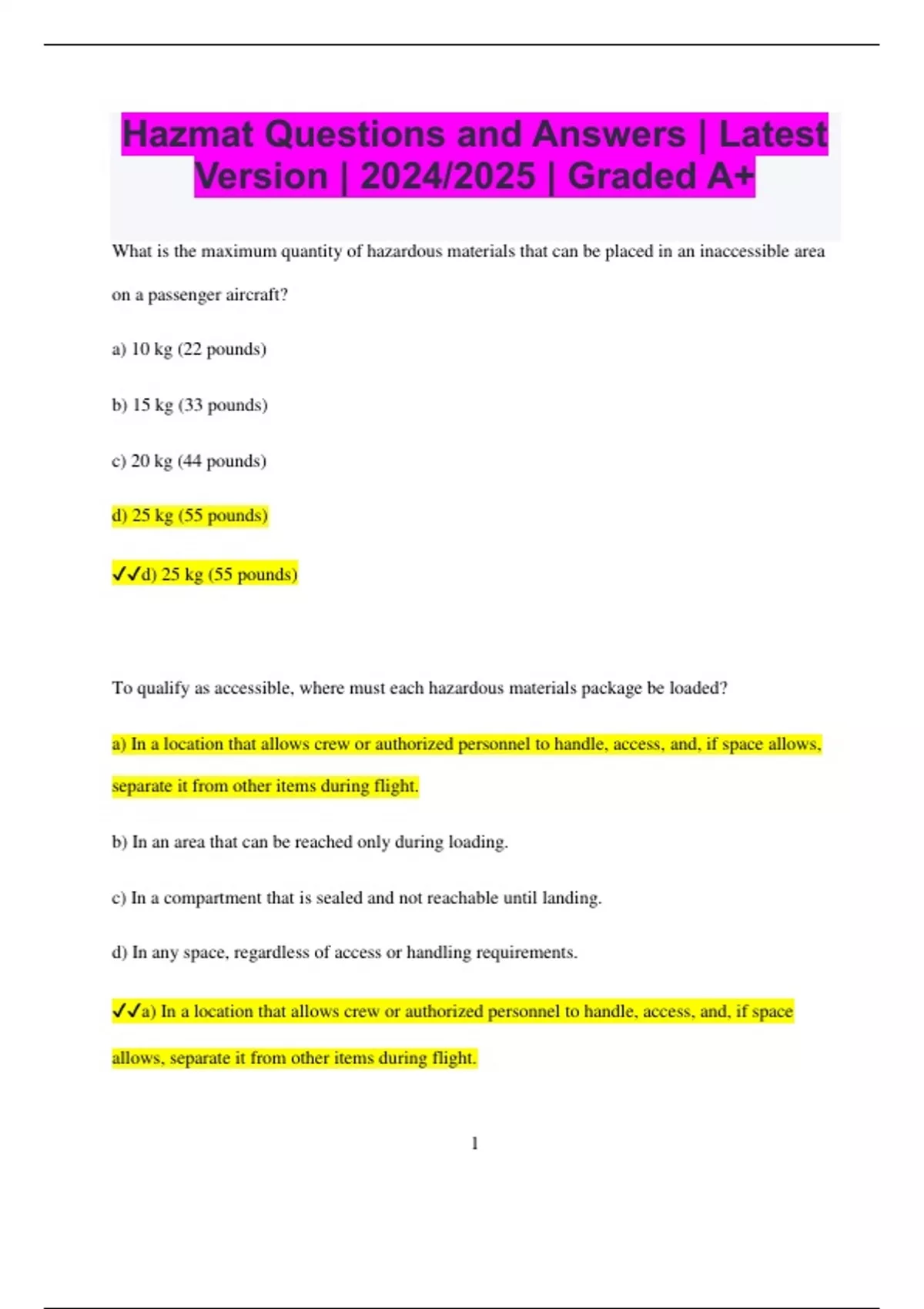 Hazmat Questions and Answers | Latest Version | 2024/2025 | Graded A+ What is the maximum quantity of hazardous materials that can be placed in an inaccessible area on a passenger aircraft? a) 10 kg (22 pounds) b) 15 kg (33 pounds) c) 20 kg (44 pounds) d) 25 kg (55 pounds) d) 25 kg (55 pounds) To qualify as accessible, where must each hazardous materials package be loaded? a) In a location that allows crew or authorized personnel to handle, access, and, if space allows, separate it from other items during flight. b) In an area that can be reached only during loading. c) In a compartment that is sealed and not reachable until landing. d) In any space, regardless of access or handling requirements. a) In a location that allows crew or authorized personnel to handle, access, and, if space allows, separate it from other items during flight. 2 Which type of hazardous material has no weight restrictions when loaded on a cargo-only aircraft? a) Flammable liquids b) Class 3 corrosive materials c) Class 6.1 infectious substances d) Explosives c) Class 6.1 infectious substances According to the segregation table, can Class 3 substances be stored adjacent to Division 5.1 materials? a) Yes, they can be placed next to each other. b) No, the table indicates they must be kept apart. c) It depends on the specific type of Class 3 material. d) It is allowed only if separated by a protective layer. b) No, the table indicates they must be kept apart. Which statement is correct regarding the loading of hazardous materials on an aircraft? a) All options are permissible.