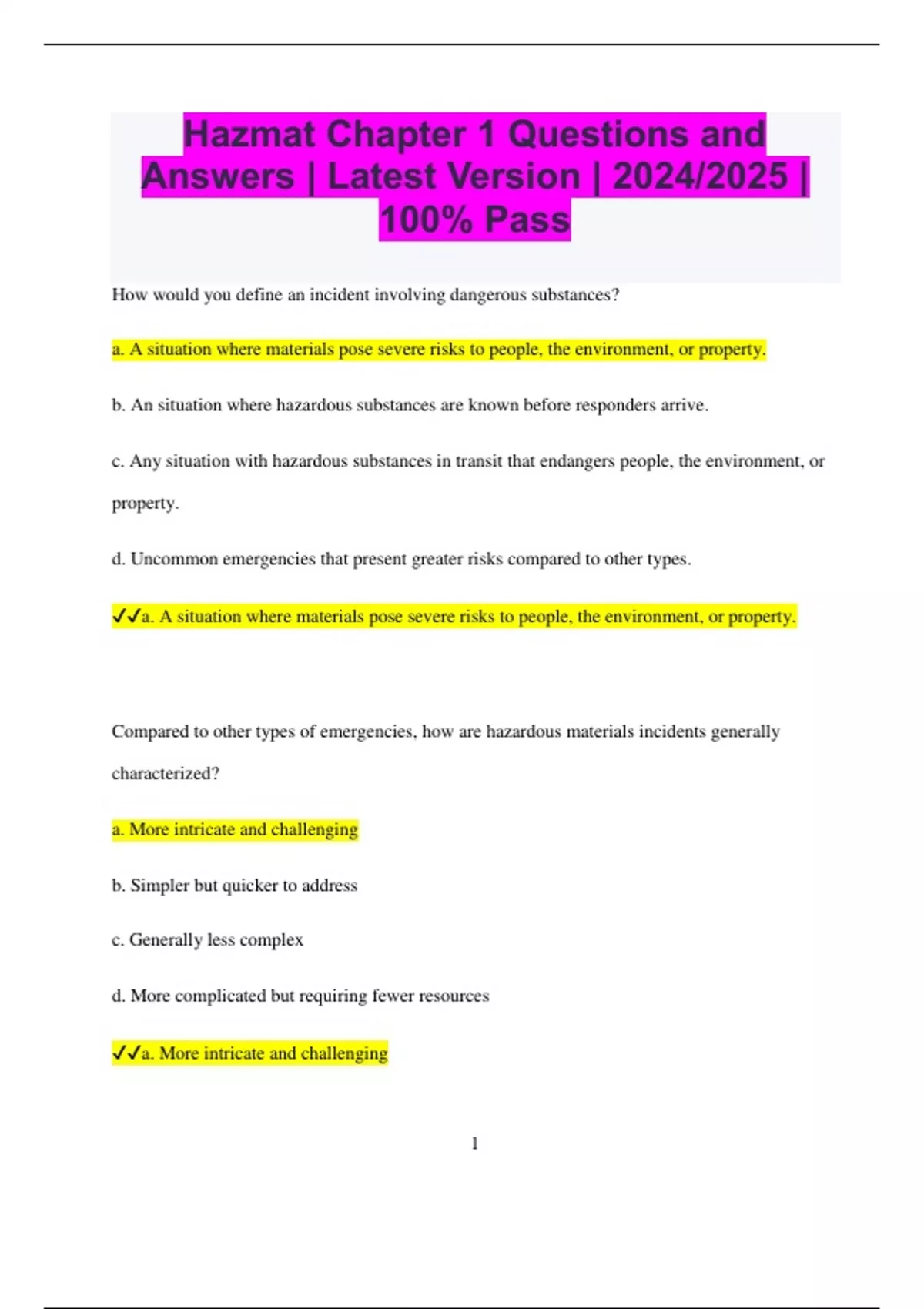 Hazmat Chapter 1 Questions and Answers | Latest Version | 2024/2025 | 100% Pass How would you define an incident involving dangerous substances? a. A situation where materials pose severe risks to people, the environment, or property. b. An situation where hazardous substances are known before responders arrive. c. Any situation with hazardous substances in transit that endangers people, the environment, or property. d. Uncommon emergencies that present greater risks compared to other types. a. A situation where materials pose severe risks to people, the environment, or property. Compared to other types of emergencies, how are hazardous materials incidents generally characterized? a. More intricate and challenging b. Simpler but quicker to address c. Generally less complex d. More complicated but requiring fewer resources a. More intricate and challenging 2 Why is it important to understand how hazardous materials can cause harm? a. To carry out follow-up incident evaluations b. To complete financial documentation accurately c. To avoid legal complications d. To help prevent injuries d. To help prevent injuries How do hazardous substances most commonly enter the human body? a. Through ingestion b. By breathing them in c. Via needle puncture d. Through skin or eye contact b. By breathing them in What term describes materials that can cause significant harm to people, property, or the environment if not handled correctly? a. Radioactive substances (RAM)