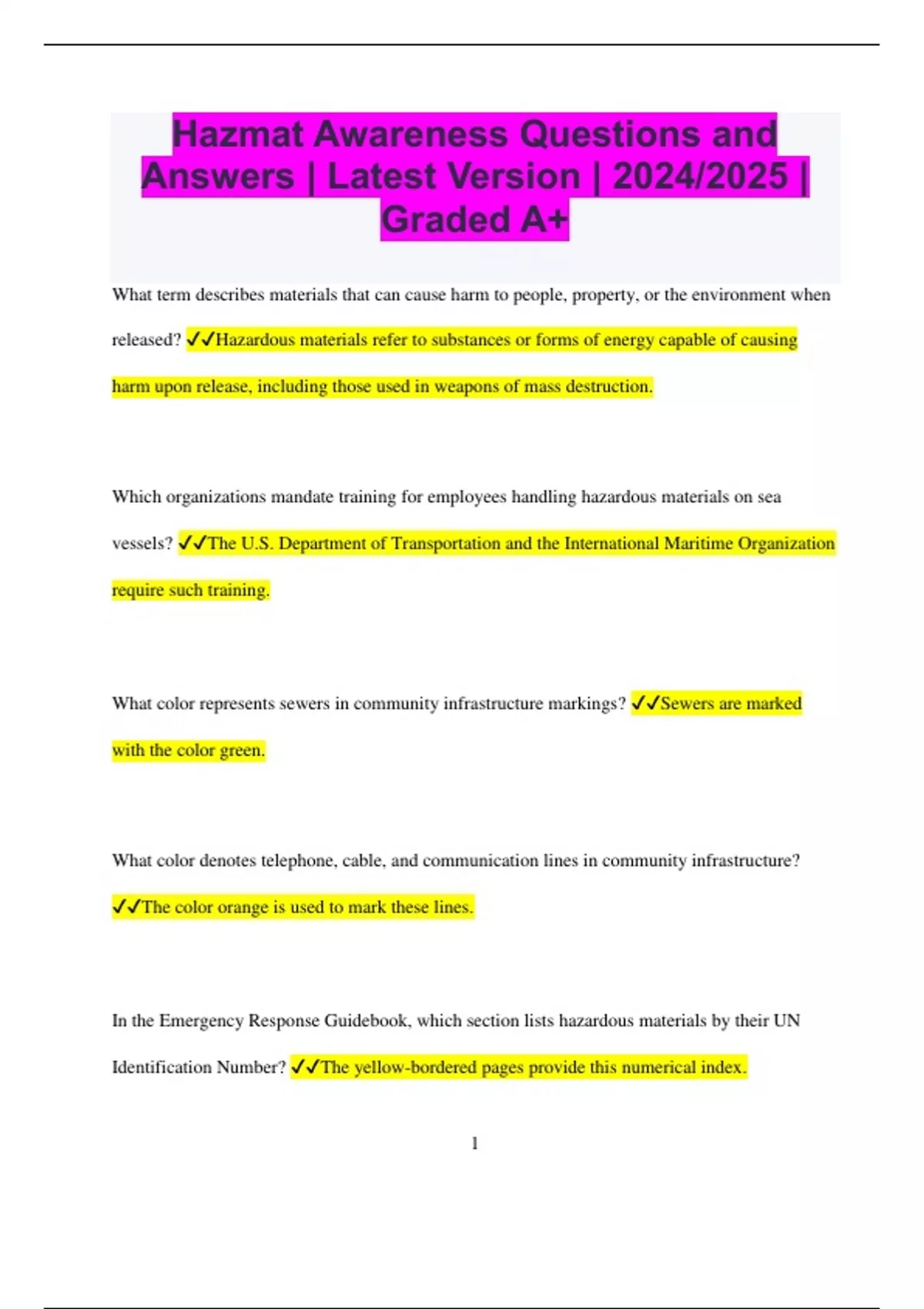 Hazmat Awareness Questions and Answers | Latest Version | 2024/2025 | Graded A+ What term describes materials that can cause harm to people, property, or the environment when released? Hazardous materials refer to substances or forms of energy capable of causing harm upon release, including those used in weapons of mass destruction. Which organizations mandate training for employees handling hazardous materials on sea vessels? The U.S. Department of Transportation and the International Maritime Organization require such training. What color represents sewers in community infrastructure markings? Sewers are marked with the color green. What color denotes telephone, cable, and communication lines in community infrastructure? The color orange is used to mark these lines. In the Emergency Response Guidebook, which section lists hazardous materials by their UN Identification Number? The yellow-bordered pages provide this numerical index. 2 Which of the following details is not typically found on a shipping paper? Health effects are not included in the product information on shipping papers. What competencies are required at the awareness level for hazardous materials? Awareness- level competencies involve recognizing hazardous materials, notifying trained responders, and securing the area. How does the Department of Transportation categorize hazardous materials? Hazardous materials are categorized into classes and divisions. In the illustration, what does the top symbol (2208, 5.1) indicate? The symbol indicates oxidizers. Which section of the Safety Data Sheet (SDS) outlines the signs and symptoms of exposure to a chemical? Section 4, titled "First Aid Measures," provides this information. What does the white diamond signify in the hazard rating system? (red top, yellow right, white bottom, blue left) The white diamond represents special hazards.