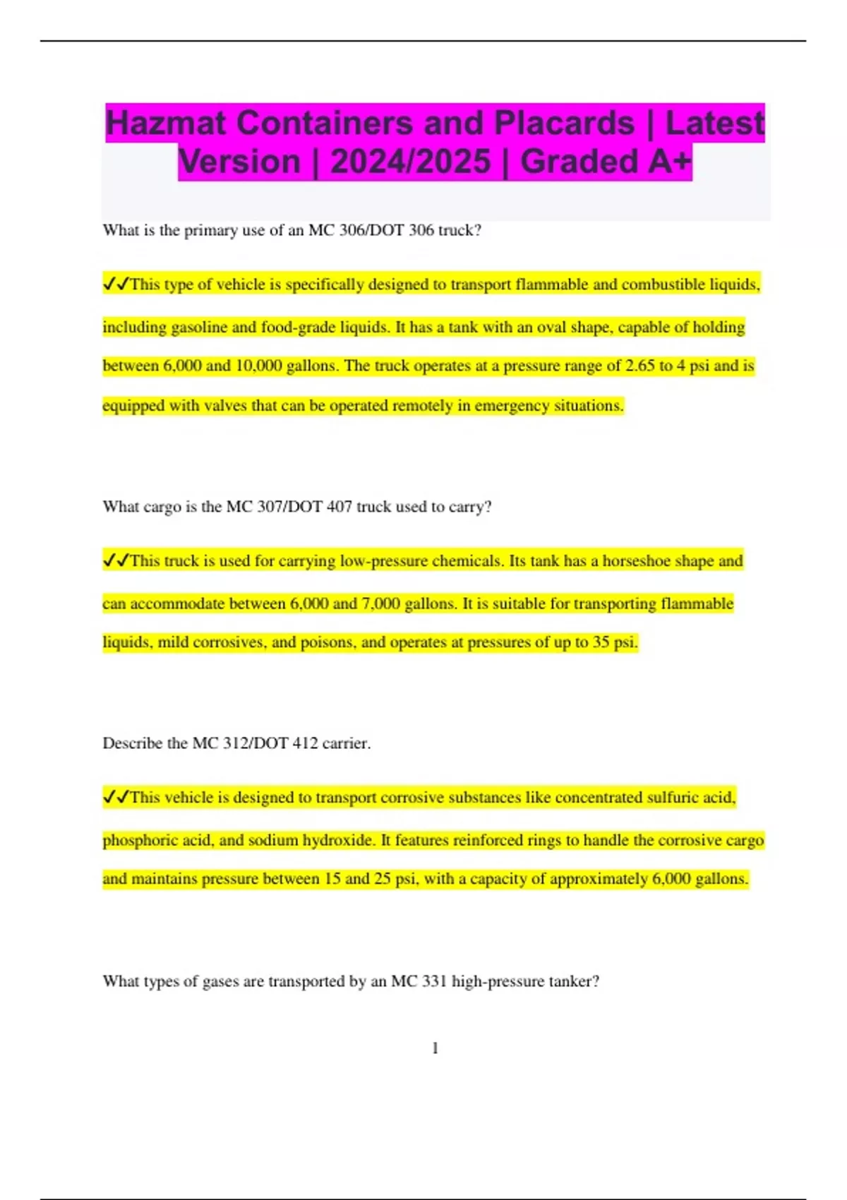 Hazmat Containers and Placards | Latest Version | 2024/2025 | Graded A+ What is the primary use of an MC 306/DOT 306 truck? This type of vehicle is specifically designed to transport flammable and combustible liquids, including gasoline and food-grade liquids. It has a tank with an oval shape, capable of holding between 6,000 and 10,000 gallons. The truck operates at a pressure range of 2.65 to 4 psi and is equipped with valves that can be operated remotely in emergency situations. What cargo is the MC 307/DOT 407 truck used to carry? This truck is used for carrying low-pressure chemicals. Its tank has a horseshoe shape and can accommodate between 6,000 and 7,000 gallons. It is suitable for transporting flammable liquids, mild corrosives, and poisons, and operates at pressures of up to 35 psi. Describe the MC 312/DOT 412 carrier. This vehicle is designed to transport corrosive substances like concentrated sulfuric acid, phosphoric acid, and sodium hydroxide. It features reinforced rings to handle the corrosive cargo and maintains pressure between 15 and 25 psi, with a capacity of approximately 6,000 gallons. What types of gases are transported by an MC 331 high-pressure tanker? 2 The MC 331 tanker is used for the transport of liquefied gases such as ammonia, propane, Freon, and butane. It has a capacity ranging from 1,000 to 11,000 gallons and operates at pressures between 250 and 300 psi. What distinguishes the MC 338 cryogenic tanker? The MC 338 tanker is designed for low-pressure operations and features a box-like structure at the rear that houses the tank's control valves. It also includes a relief valve located near this control box. What does a tube trailer carry, and what is its design? Tube trailers are used to transport compressed gases like hydrogen, oxygen, helium, and methane. These trailers are equipped with individual relief valves for each cylinder and operate at pressures from 3,000 to 5,000 psi. The control box is situated at the rear end of the trailer. What materials are transported using a dry bulk trailer? Dry bulk trailers are designed for hauling non-liquid items such as powders, pellets, fertilizers, or grains. They are not pressurized and have a V-shaped tank with rounded sides to facilitate the transportation of bulk materials. What is the role of a box truck