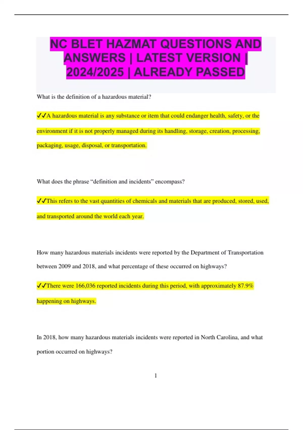 NC BLET HAZMAT QUESTIONS AND ANSWERS | LATEST VERSION | 2024/2025 | ALREADY PASSED