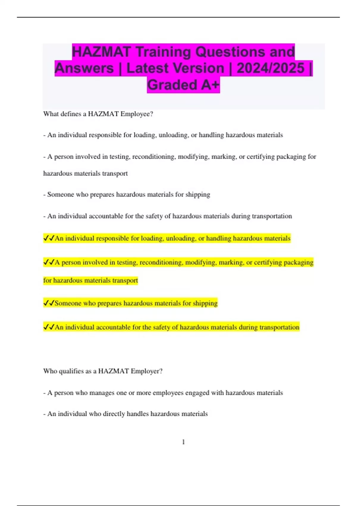 HAZMAT Training Questions and Answers | Latest Version | 2024/2025 | Graded A+ What defines a HAZMAT Employee? - An individual responsible for loading, unloading, or handling hazardous materials - A person involved in testing, reconditioning, modifying, marking, or certifying packaging for hazardous materials transport - Someone who prepares hazardous materials for shipping - An individual accountable for the safety of hazardous materials during transportation An individual responsible for loading, unloading, or handling hazardous materials A person involved in testing, reconditioning, modifying, marking, or certifying packaging for hazardous materials transport Someone who prepares hazardous materials for shipping An individual accountable for the safety of hazardous materials during transportation Who qualifies as a HAZMAT Employer? - A person who manages one or more employees engaged with hazardous materials - An individual who directly handles hazardous materials 2 - A company that transports hazardous materials - An organization that provides training on hazardous materials A person who manages one or more employees engaged with hazardous materials How is training defined in the context of HAZMAT? - An organized program designed to ensure that HAZMAT employees understand hazardous materials, relevant regulations, and their responsibilities - A series of tests for HAZMAT employees - On-the-job experience with hazardous materials - Informal learning about hazardous materials An organized program designed to ensure that HAZMAT employees understand hazardous materials, relevant regulations, and their responsibilities What obligations does a HAZMAT employer have? - Provide training and testing (Once during the initial semester only for HCC) - Ensure that training is documented and renewed every three years, and within 90 days of hiring - Certify employees’ training completion - Maintain current training records for each employee 3 Provide training and testing (Once during the initial semester only for HCC) Ensure that training is documented and renewed every three years, and within 90 days of hiring Certify employees’ training completion Maintain current training records for each employee What details should be included in training records? - The date when the training was completed - Certification of completion