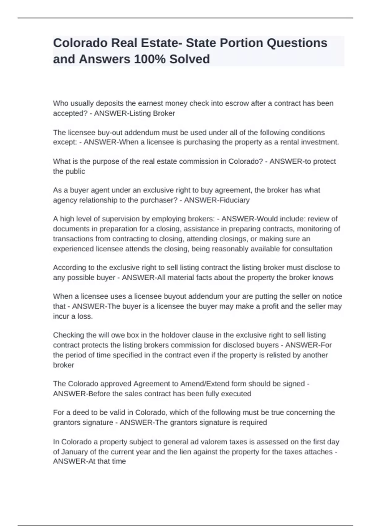 Who usually deposits the earnest money check into escrow after a contract has been accepted? - ANSWER-Listing Broker The licensee buy-out addendum must be used under all of the following conditions except: - ANSWER-When a licensee is purchasing the property as a rental investment. What is the purpose of the real estate commission in Colorado? - ANSWER-to protect the public As a buyer agent under an exclusive right to buy agreement, the broker has what agency relationship to the purchaser? - ANSWER-Fiduciary A high level of supervision by employing brokers: - ANSWER-Would include: review of documents in preparation for a closing, assistance in preparing contracts, monitoring of transactions from contracting to closing, attending closings, or making sure an experienced licensee attends the closing, being reasonably available for consultation According to the exclusive right to sell listing contract the listing broker must disclose to any possible buyer - ANSWER-All material facts about the property the broker knows When a licensee uses a licensee buyout addendum your are putting the seller on notice that - ANSWER-The buyer is a licensee the buyer may make a profit and the seller may incur a loss. Checking the will owe box in the holdover clause in the exclusive right to sell listing contract protects the listing brokers commission for disclosed buyers - ANSWER-For the period of time specified in the contract even if the property is relisted by another broker The Colorado approved Agreement to Amend/Extend form should be signed - ANSWER-Before the sales contract has been fully executed For a deed to be valid in Colorado, which of the following must be true concerning the grantors signature - ANSWER-The grantors signature is required In Colorado a property subject to general ad valorem taxes is assessed on the first day of January of the current year and the lien against the property for the taxes attaches - ANSWER-At that time A licensee may accept compensation from: - ANSWER-The licensee's employing broker only A transaction broker when handling both sides of the transaction has a fiduciary responsibility to - ANSWER-Neither the buyer nor the seller Which one of the following lists an unacceptable combination of relationships for a single broker on a particular transaction - ANSWER-Transaction broker for the buyer and agent for the seller