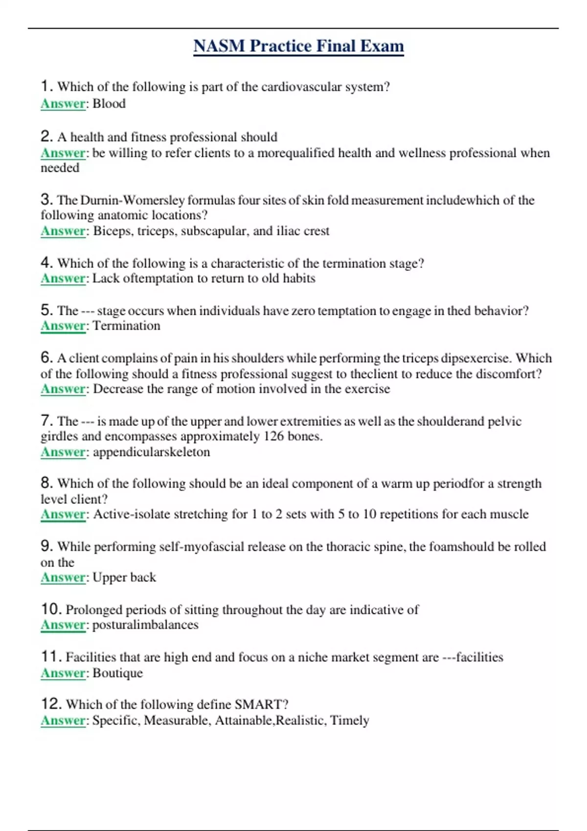 NASM Practice Final Exam ( Latest 2024 / 2025 ) Actual Questions and Answers 100% Correct 1. Which of the following is part of the cardiovascular system? Answer: Blood 2. A health and fitness professional should Answer: be willing to refer clients to a morequalified health and wellness professional when needed 3. The Durnin-Womersley formulasfoursites ofskin fold measurement includewhich of the following anatomic locations? Answer: Biceps, triceps, subscapular, and iliac crest 4. Which of the following is a characteristic of the termination stage? Answer: Lack oftemptation to return to old habits 5. The ---stage occurs when individuals have zero temptation to engage in thed behavior? Answer: Termination 6. A client complains of pain in hisshoulders while performing the triceps dipsexercise. Which of the following should a fitness professional suggest to theclient to reduce the discomfort? Answer: Decrease the range of motion involved in the exercise 7. The --- is made up of the upper and lower extremities as well asthe shoulderand pelvic girdles and encompasses approximately 126 bones. Answer: appendicularskeleton 8. Which of the following should be an ideal component of a warm up periodfor a strength level client? Answer: Active-isolate stretching for 1 to 2 sets with 5 to 10 repetitions for each muscle 9. While performing self-myofascial release on the thoracic spine, the foamshould be rolled on the Answer: Upper back 10. Prolonged periods of sitting throughout the day are indicative of Answer: posturalimbalances 11. Facilities that are high end and focus on a niche market segment are ---facilities Answer: Boutique 12. Which of the following define SMART? Answer: Specific, Measurable, Attainable,Realistic, Timely