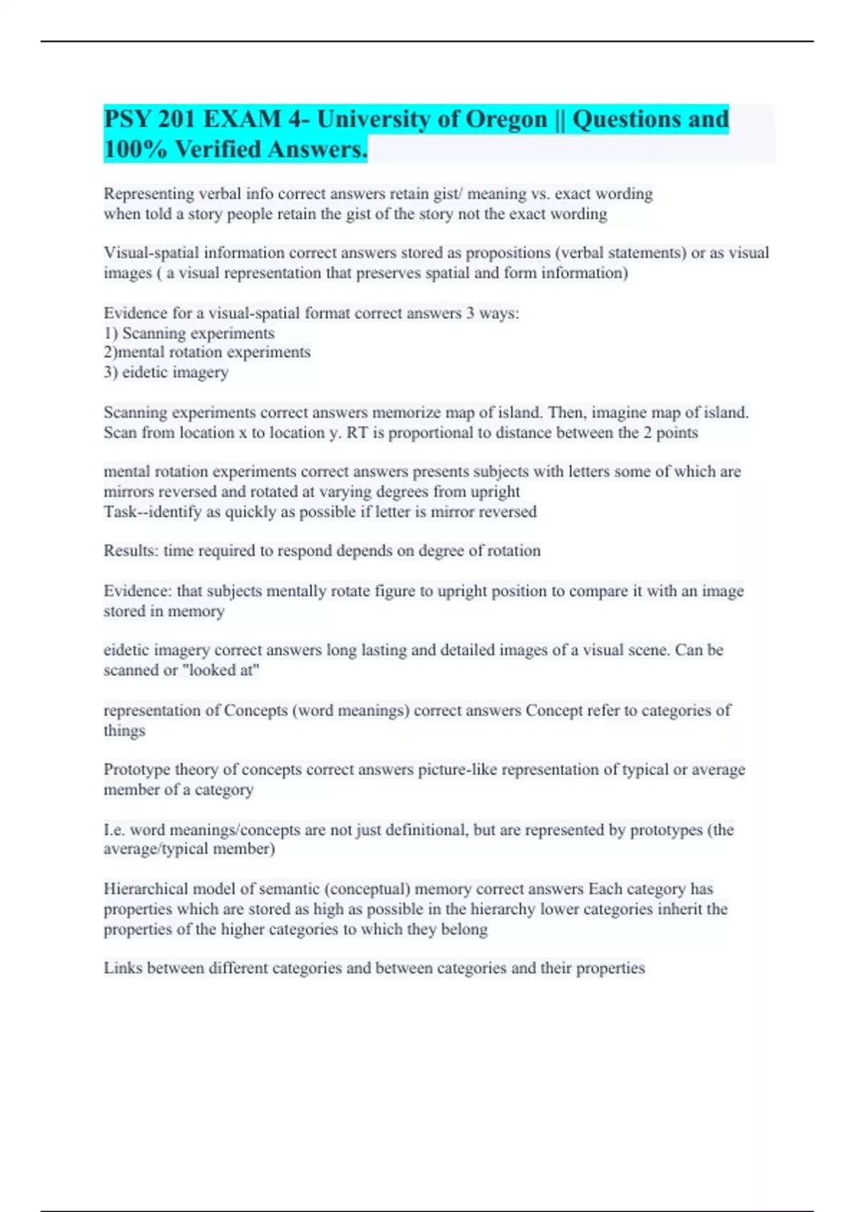 Representing verbal info correct answers retain gist/ meaning vs. exact wording when told a story people retain the gist of the story not the exact wording Visual-spatial information correct answers stored as propositions (verbal statements) or as visual images ( a visual representation that preserves spatial and form information) Evidence for a visual-spatial format correct answers 3 ways: 1) Scanning experiments 2)mental rotation experiments 3) eidetic imagery Scanning experiments correct answers memorize map of island. Then, imagine map of island. Scan from location x to location y. RT is proportional to distance between the 2 points mental rotation experiments correct answers presents subjects with letters some of which are mirrors reversed and rotated at varying degrees from upright Task--identify as quickly as possible if letter is mirror reversed Results: time required to respond depends on degree of rotation Evidence: that subjects mentally rotate figure to upright position to compare it with an image stored in memory eidetic imagery correct answers long lasting and detailed images of a visual scene. Can be scanned or "looked at" representation of Concepts (word meanings) correct answers Concept refer to categories of things Prototype theory of concepts correct answers picture-like representation of typical or average member of a category I.e. word meanings/concepts are not just definitional, but are represented by prototypes (the average/typical member) Hierarchical model of semantic (conceptual) memory correct answers Each category has properties which are stored as high as possible in the hierarchy lower categories inherit the properties of the higher categories to which they belong Links between different categories and between categories and their properties