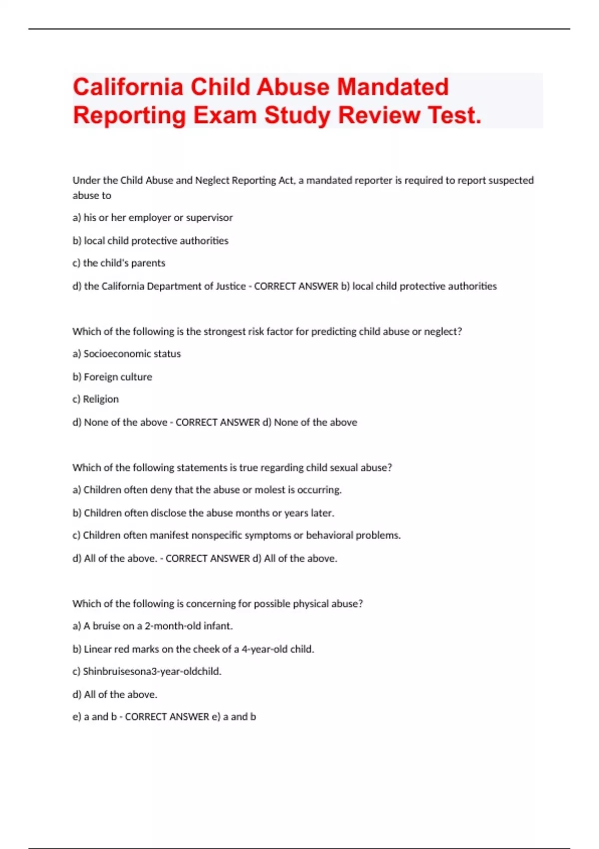 California Child Abuse Mandated Reporting Exam Study Review Test. Under the Child Abuse and Neglect Reporting Act, a mandated reporter is required to report suspected abuse to a) his or her employer or supervisor b) local child protective authorities c) the child's parents d) the California Department of Justice - CORRECT ANSWER b) local child protective authorities Which of the following is the strongest risk factor for predicting child abuse or neglect? a) Socioeconomic status b) Foreign culture c) Religion d) None of the above - CORRECT ANSWER d) None of the above Which of the following statements is true regarding child sexual abuse? a) Children often deny that the abuse or molest is occurring. b) Children often disclose the abuse months or years later. c) Children often manifest nonspecific symptoms or behavioral problems. d) All of the above. - CORRECT ANSWER d) All of the above. Which of the following is concerning for possible physical abuse? a) A bruise on a 2-month-old infant. b) Linear red marks on the cheek of a 4-year-old child. c) Shinbruisesona3-year-oldchild. d) All of the above. e) a and b - CORRECT ANSWER e) a and b
