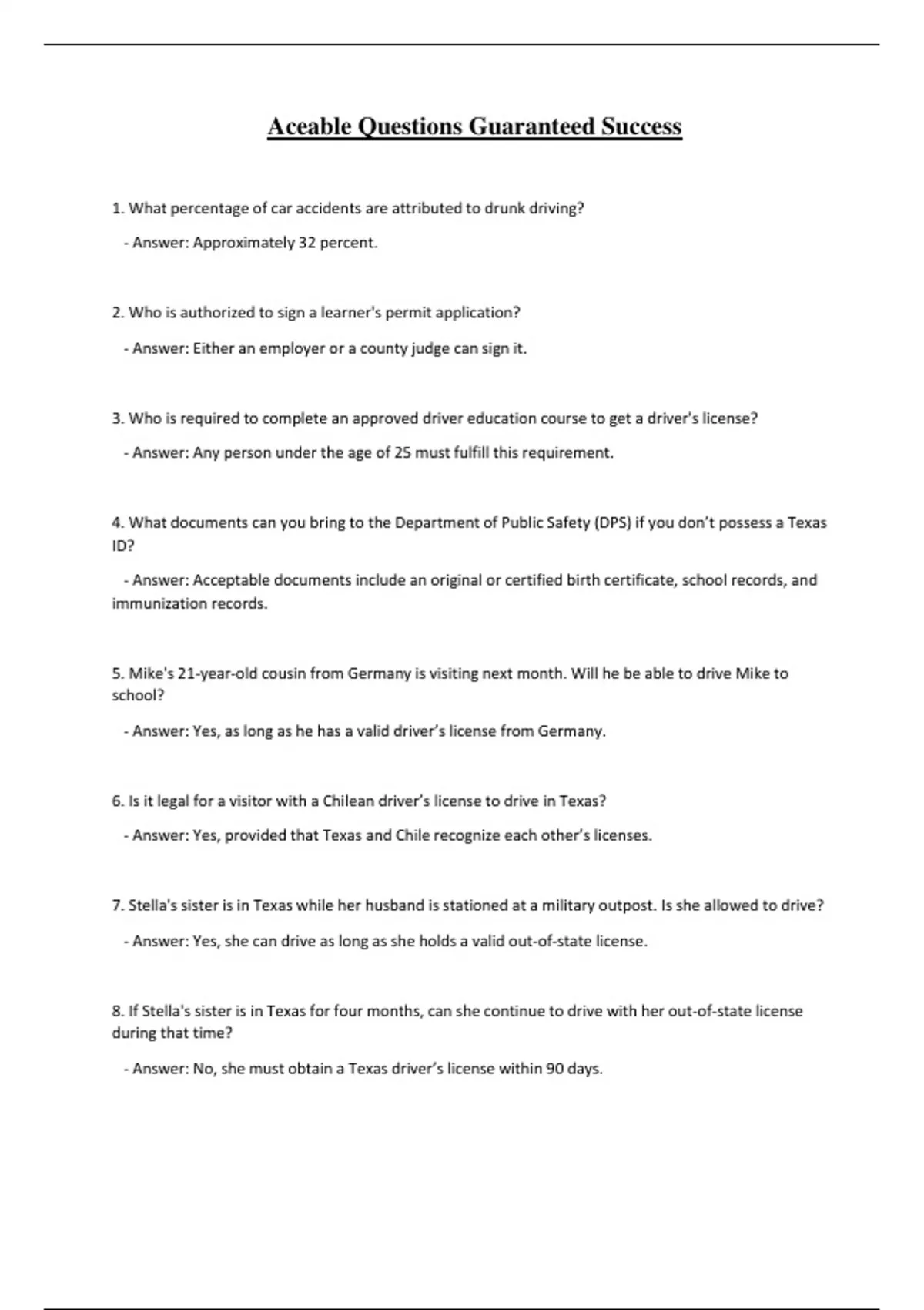 Aceable Questions Guaranteed Success 1. What percentage of car accidents are attributed to drunk driving? - Answer: Approximately 32 percent. 2. Who is authorized to sign a learner's permit application? - Answer: Either an employer or a county judge can sign it. 3. Who is required to complete an approved driver education course to get a driver's license? - Answer: Any person under the age of 25 must fulfill this requirement. 4. What documents can you bring to the Department of Public Safety (DPS) if you don’t possess a Texas ID? - Answer: Acceptable documents include an original or certified birth certificate, school records, and immunization records. 5. Mike's 21-year-old cousin from Germany is visiting next month. Will he be able to drive Mike to school? - Answer: Yes, as long as he has a valid driver’s license from Germany. 6. Is it legal for a visitor with a Chilean driver’s license to drive in Texas? - Answer: Yes, provided that Texas and Chile recognize each other’s licenses. 7. Stella's sister is in Texas while her husband is stationed at a military outpost. Is she allowed to drive? - Answer: Yes, she can drive as long as she holds a valid out-of-state license. 8. If Stella's sister is in Texas for four months, can she continue to drive with her out-of-state license during that time? - Answer: No, she must obtain a Texas driver’s license within 90 days. 9. Who needs to be in the passenger seat when someone with a learner's license is driving? - Answer: A licensed driver who is at least 21 years old must occupy that seat. 10. What can Pete do if his mother is unwell and he needs to take his younger sister to school with his learner's license at 17? - Answer: He can apply for a Minor Restricted Driver License. 11. Does a regular Class C driver’s license permit the holder to drive a motorcycle? - Answer: False. 12. Stella has a Class B license and will assist her father on the farm. Is she permitted to use a farm trailer? - Answer: Yes, she is allowed to use a farm trailer with her Class B license. 13. What does the Class M designation cover? - Answer: It includes motorcycles for individuals over 16 years old and mopeds for individuals over 15 with parental permission. 14. What are the requirements for a Class C license? - Answer: A Class C license is for vehicles with a gross vehicle weight rating (GVWR) of less than 26,001 pounds and for trailers weighing less than 10,000 pounds. 15. What are the specifications for driving commercial vehicles with a Class B license? - Answer: Class B licenses permit driving vehicles with a GVWR greater than 26,001 pounds, vehicles weighing less than 10,000 pounds, trailers weighing less than 20,000 pounds, and buses designed for 24 or more passengers. 16. What does a Class A CDL allow you to operate? - Answer: It covers rights for operating vehicles classified under both Class B and Class C, but not commercial vehicles. 17. What type of license does Ryan's dad hold as a truck driver for a major company? - Answer: He has a Commercial Driver License (CDL). 18. What is the minimum age for obtaining a CDL to work in a delivery company in Texas? - Answer: You must be at least 18 years old. 19. What can a Class C CDL do? - Answer: It allows you to transport between 16 to 23 people and carry hazardous materials. 20. Is Tyeera eligible to drive a tourist van with just a basic Class C license? - Answer: No, she needs a Class C Commercial Driver License to drive a tourist van. 21. What is permissible with a Class B CDL? - Answer: Holders can drive commercial vehicles over 26,001 pounds, tow vehicles under 10,000 pounds, and carry 24 or more passengers. 22. What happens if your friend borrows your driver’s license and gets pulled over? - Answer: Your driver’s license will likely be suspended. 23. If a friend thinks it's amusing to graffiti a stop sign by changing "STOP" to "GO," should you participate? - Answer: No, joining in could lead to a graffiti conviction that would result in license suspension. 24. Under what circumstances might your driver’s license be suspended? - Answer: It may be suspended if you accumulate four or more traffic violations within a 12-month period (or seven within 24 months). 25. If your driver’s license is suspended in another state, can you still drive legally in Texas? - Answer: No, your license will be suspended in Texas, regardless of where the conviction occurred. 26. You’re under 21, and a friend offers you beer obtained from an older sibling. Will this impact your driving privileges? - Answer: Yes, a conviction for possession of alcohol will lead to an automatic suspension of your license. 27. Can skipping school regularly lead to the suspension of your driver’s license?