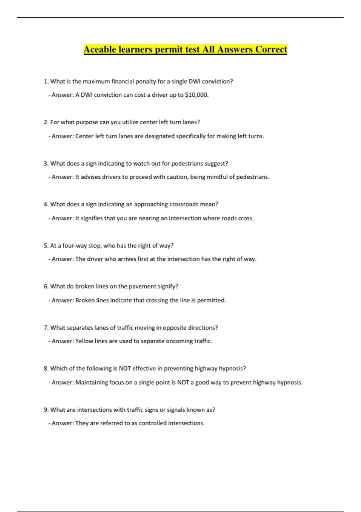 Aceable learners permit test All Answers Correct 1. What is the maximum financial penalty for a single DWI conviction? - Answer: A DWI conviction can cost a driver up to $10,000. 2. For what purpose can you utilize center left turn lanes? - Answer: Center left turn lanes are designated specifically for making left turns. 3. What does a sign indicating to watch out for pedestrians suggest? - Answer: It advises drivers to proceed with caution, being mindful of pedestrians. 4. What does a sign indicating an approaching crossroads mean? - Answer: It signifies that you are nearing an intersection where roads cross. 5. At a four-way stop, who has the right of way? - Answer: The driver who arrives first at the intersection has the right of way. 6. What do broken lines on the pavement signify? - Answer: Broken lines indicate that crossing the line is permitted. 7. What separates lanes of traffic moving in opposite directions? - Answer: Yellow lines are used to separate oncoming traffic. 8. Which of the following is NOT effective in preventing highway hypnosis? - Answer: Maintaining focus on a single point is NOT a good way to prevent highway hypnosis. 9. What are intersections with traffic signs or signals known as? - Answer: They are referred to as controlled intersections. 10. When is it appropriate to use high beams? - Answer: You should use high beams when driving alone on poorly lit roads. 11. What should you do at a flashing red traffic light? - Answer: Come to a complete stop and proceed only when the intersection is clear. 12. Regularly checking the air pressure in your tires helps avoid which issues? - Answer: It helps prevent blowouts, flat tires, and skidding. 13. What is Texas's policy regarding minors driving under the influence? - Answer: Texas has a zero tolerance policy for minors who drive under the influence. 14. How many alcoholic beverages can a driver safely consume before driving? - Answer: Any amount of alcoholic drinks is considered too much for a driver. 15. What does it mean when a sign indicates traffic can pass on either side? - Answer: It means that vehicles can overtake on both sides of the road. 16. What does a sign indicating bumpy pavement for motorcyclists alert you to? - Answer: It warns that the road surface may be uneven and poses a potential hazard for motorcyclists. 17. What should you do upon seeing a yellow traffic light? - Answer: You should stop if it is safe to do so. 18. What are the potential consequences of speeding in a construction zone where workers are present? - Answer: Fines for speeding may be doubled in those areas. 19. What does a sign indicating a right then left turn ahead indicate? - Answer: It informs drivers that the road will first turn right and then turn left shortly after. 20. What information does a sign providing a suggested speed for an exit ramp convey? - Answer: It indicates the recommended speed for safely navigating the exit ramp. 21. Are bicyclists legally allowed to use public roads? - Answer: False, they are allowed to use the road legally. 22. What is NOT a recommended practice to prevent skidding? - Answer: Braking harder than usual on wet roads is NOT advisable. 23. When applying for a driver's license, what type of test must you consent to if requested by law enforcement? - Answer: You must consent to a blood alcohol test. 24. What does a sign indicating a soft shoulder signify? - Answer: It means the shoulder of the road is unpaved and may be unstable. 25. What is the purpose of the far right lane on the highway? - Answer: It is designated for slower traffic. 26. What is the term for the amount of space that should be maintained in front of your vehicle while driving? - Answer: This is referred to as the following distance.