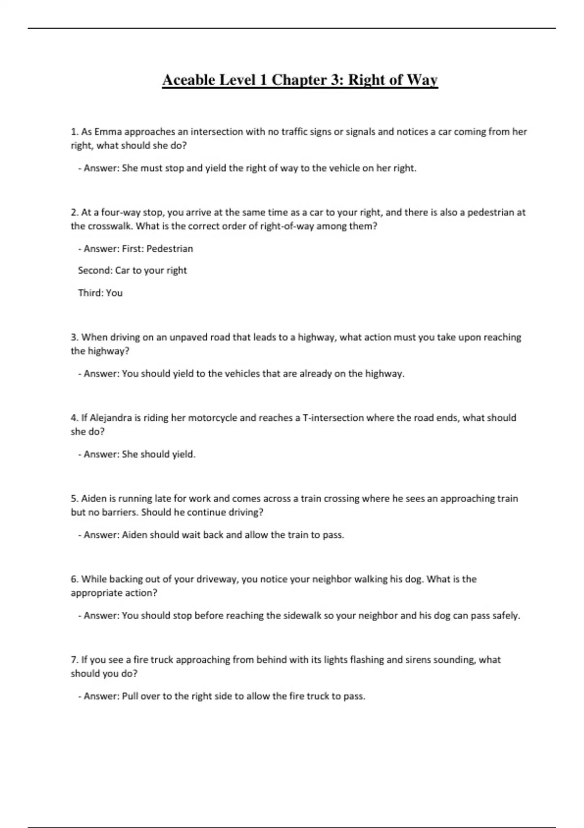 1. As Emma approaches an intersection with no traffic signs or signals and notices a car coming from her