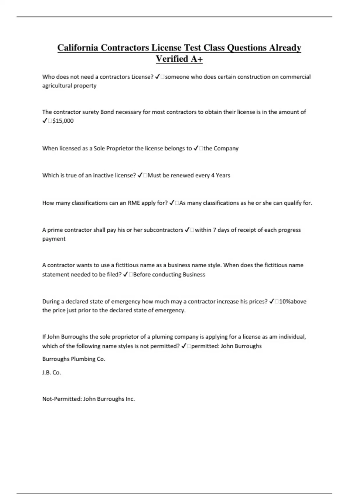 California Contractors License Test Class Questions Already Verified A+ Who does not need a contractors License? ️someone who does certain construction on commercial agricultural property The contractor surety Bond necessary for most contractors to obtain their license is in the amount of ️$15,000 When licensed as a Sole Proprietor the license belongs to ️the Company Which is true of an inactive license? ️Must be renewed every 4 Years How many classifications can an RME apply for? ️As many classifications as he or she can qualify for. A prime contractor shall pay his or her subcontractors ️within 7 days of receipt of each progress payment A contractor wants to use a fictitious name as a business name style. When does the fictitious name statement needed to be filed? ️Before conducting Business During a declared state of emergency how much may a contractor increase his prices? ️10%above the price just prior to the declared state of emergency. If John Burroughs the sole proprietor of a pluming company is applying for a license as am individual, which of the following name styles is not permitted? ️permitted: John Burroughs Burroughs Plumbing Co. J.B. Co. Not-Permitted: John Burroughs Inc. Active licenses must be registered every------ and inactive licenses should be registered every----- ️2 years, 4 years After you pass the state license test what should you do in order to receive an active license number? ️Pay your registration fees. Submit a complete asbestos open book examination. Show proof of workers comp insurance or submit a waiver of workers comp and submit your "pass" letter. Which of the following may qualify for more than one contractors license? ️Sole proprietor. How many classifications may a qualifier add to a license? ️As many qualifications as he qualifies for. which of the following may be protected by a Contract Bond? ️-A client damaged by the contractors violation of the contract. -Any person damaged by contractor fraud -Any contractor damaged by contractors failure to pay wages. What is the best way for the homeowner to protect his property from having a lien placed on his property, when signing a Home improvement contract. ️Require the Prime Contractor to Supply a performance and Payment Bond. CSLB established the State Wide Investigative Fraud Team (SWIFT). CSLB'S SWIFT has the authority to: ️Cite those not properly licensed Which is not part of the Home Improvement Contract? ️Preliminary Notice What us the purpose of the Preliminary Notice? ️Assert Mechanic Liens and Stop notice Rights Preliminary Notices are filed? ️within 20 days from first furnishing labor or materials. Which of the following is the most important practices to follow when trying to avoid disagreements with an owner? ️Be sure to include a detailed description of the project and everything that is to be done in the contract. Why should a contractor keep a record of all Change Orders? ️State law Requires It Which of the following people file a Stop Notice? ️a subcontractor contracted to do specialty trade and was not paid. Who signs a "Joint Control Agreement"? ️The lender, the property owner and the Prime Contractor. How long will the CSLB hold a contractor responsible for observable defects? ️4 years The CSLB offers a free voluntary arbitration program for disputes alleged damages: ️Between $15,000 and $50,000 If a contractor includes provision in a contract for use of private arbitration and a dispute between the owner and the contractor makes an arbitration necessary, who will bare the cost of a private arbitrator? ️The Owner and contractor will slit the cost of the arbitration. If a contractor provides the owner with a 10-year written warranty covering a patio cover he has installed, and the cover begins to deteriorate after 5 years of being installed which is true? ️the state will hold the contractor liable for the entire term of the written warranty. Who is responsible for providing the owner a copy of the "Notice of Cancellation"? ️The Prime Contractor In which of the following circumstances must you provide your license number? ️All contracts, all Advertising, All preliminary Notices. Who is responsible for determining when the project is complete? ️The owner/ his Agent Stop Notices are Bonder for ️1 & 1/4 the amount of the claim In drawing up "Home Improvement Contracts," contractors should pay attention to the requirements of print typeface and point size of the notices and disclosures. Unless a larger typeface is specified in the law (Business and professions Code) text in any printed form should be: ️10-pt Typeface and the headers should be at least 10-pt Boldface The costs of running your business including office expenses etc, is called: ️Overhead expenses Direct Labor is compromised of: ️cost for labor and payroll taxes Which of the following is an asset in the Balance sheet? ️Accounts Receivable Direct Costs Consist of: ️Direct Labor, Direct labor burden, direct materials and other direct costs. Good Cash Flow is achieved when: ️current liabilities are less than current assets Equity is: ️Total assets less total liabilities Networking Capital is: ️the difference between current assets and curr