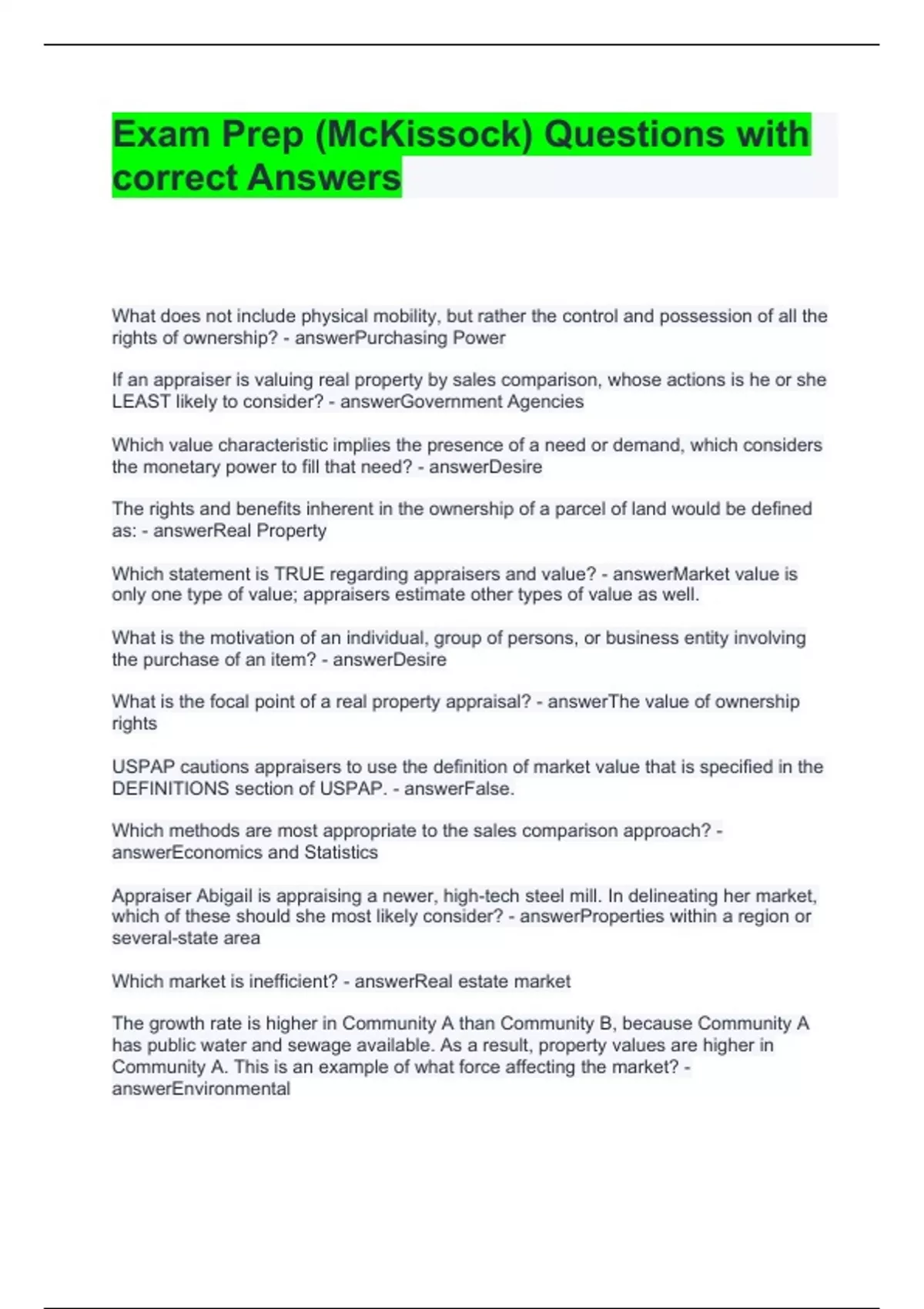 Exam Prep (McKissock) Questions with correct Answers What does not include physical mobility, but rather the control and possession of all the rights of ownership? Purchasing Power If an appraiser is valuing real property by sales comparison, whose actions is he or she LEAST likely to consider? Government Agencies Which value characteristic implies the presence of a need or demand, which considers the monetary power to fill that need? Desire The rights and benefits inherent in the ownership of a parcel of land would be defined as: Real Property Which statement is TRUE regarding appraisers and value? Market value is only one type of value; appraisers estimate other types of value as well. What is the motivation of an individual, group of persons, or business entity involving the purchase of an item? Desire What is the focal point of a real property appraisal? The value of ownership rights USPAP cautions appraisers to use the definition of market value that is specified in the DEFINITIONS section of USPAP. False. Which methods are most appropriate to the sales comparison approach? Economics and Statistics Appraiser Abigail is appraising a newer, high-tech steel mill. In delineating her market, which of these should she most likely consider? Properties within a region or several-state area Which market is inefficient? Real estate market The growth rate is higher in Community A than Community B, because Community A has public water and sewage available. As a result, property values are higher in Community A. This is an example of what force affecting the market? Environmental A large, old, dilapidated commercial building sits in an economically depressed section of the city. There are no market participants who have the financial capability to renovate and use such a large building. This is an example of what force? Economic Which statement is TRUE regarding the appraisal development process? Development and reporting are two separate and distinct functions Harry is preparing a real property appraisal report for his client. Which USPAP Standard must he follow when preparing this report? STANDARD 2 An appraiser inspects a subject property, which is a vacant apartment building. The appraiser's measurements and field notes from the inspection would be considered what type of data? Specific Data An appraiser is valuing a small apartment building. The appraiser gathers information on demographics and employment trends, which is useful in analyzing the market. This would be considered what type of data? General Data The appraisal development process and appraisal reporting process are considered to be one function. False In the appraisal process, what type of data pertains only to the subject property and comparables? Specific Data Dave is completing a market value appraisal on an office building. Which statement will most likely be TRUE regarding his highest and best use analysis? He will have to develop two highest and best use opinions. What is the most profitable use to which a property can be put? Highest and best use When considering legal permissibility and current land use regulations, an appraiser must also consider __________. Reasonably probable modifications of land use regulations Margot is appraising a vacant site which is suitable for commercial development. In selecting comparable sales, what would likely be her most important consideration? Sales should have the same highest and best use A property is improved with a building, and is valued at $425,000. It would cost $50,000 to raze and remove the building, and the value of the vacant site would be $500,000. Under this scenario, razing and removing the building would be considered ____________. Financially feasible An appraiser takes secondary data on a sale from the local MLS, and personally verifies elements of the transaction and the physical characteristics of the property with the purchaser. This sale would now be considered what type of data? Primary Data A building owner installs a new "green" roof on the structure at a cost of $300,000. The value of the building only increases by $200,000 as a result of the new roof. This demonstrates which economic principle? Contribution Value is a fact, or an estimate of fact. False The Concentric Zone Model includes which zones? Commuter, residential, working class, transition, factory, Loop or Central Business District Which statement is FALSE regarding the sales comparison approach? When the appraiser has an understanding of value influences in the market, the approach is more reliable. Cyndi contacts the buyer and verifies that a comparable sale she is using was purchased on the open market, between a typically-motivated seller and buyer, who were not related to each other. What type of sale is this? Arm's length transfer What is the primary purpose of the sales comparison approach? To arrive at a value indication for the subject property The sales comparison approach is primarily based on what principle? Substitution A property being appraised has a debt coverage ratio of 1.1. What does this mean? The property generates enough income to make the mortgage payment. Peggy blackmails Frank into selling his property to her. The sale appears in the local MLS and is reported in the local assessment office as a valid sale. Is this an arm's length transfer? No The sales comparison approach is most effective when the subject and comparable sales all have the same potential highest and best use. True What helps appraisers understand and apply accurate analysis in the evaluation of real estate? Statistical techniques The empirical rule states that in a bell-shaped curve, what percentage of observations will fall within two standard deviations of the mean? 95 Measures of central tendency include all of the following EXCEPT: Variance What is the principle which holds that in a bell-shaped curve, 68% of the observations will fall within one standard deviation of the mean? Empirical rule What is t
