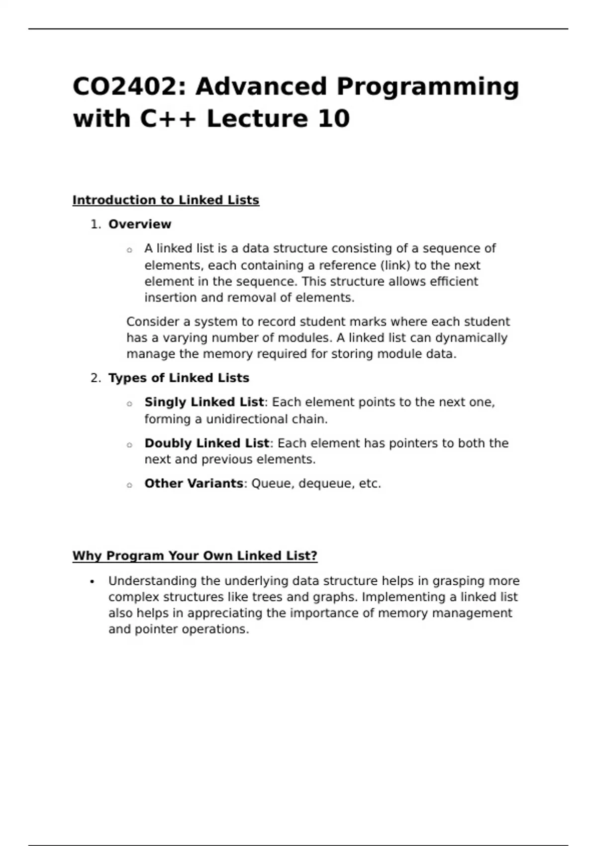 This document provides detailed notes from Lecture 10 of the CO2402 course on Advanced Programming with C++. The lecture focuses on linked lists, an essential data structure in computer science. It covers the fundamental concepts and implementations of singly and doubly linked lists, explaining how these structures allow efficient insertion and removal of elements.