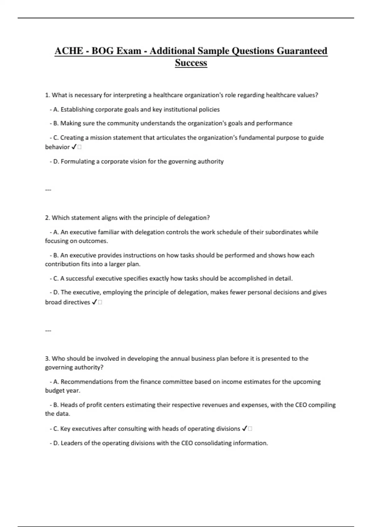 ACHE - BOG Exam - Additional Sample Questions Guaranteed Success 1. What is necessary for interpreting a healthcare organization's role regarding healthcare values? - A. Establishing corporate goals and key institutional policies - B. Making sure the community understands the organization's goals and performance - C. Creating a mission statement that articulates the organization’s fundamental purpose to guide behavior ️ - D. Formulating a corporate vision for the governing authority --- 2. Which statement aligns with the principle of delegation? - A. An executive familiar with delegation controls the work schedule of their subordinates while focusing on outcomes. - B. An executive provides instructions on how tasks should be performed and shows how each contribution fits into a larger plan. - C. A successful executive specifies exactly how tasks should be accomplished in detail. - D. The executive, employing the principle of delegation, makes fewer personal decisions and gives broad directives ️ --- 3. Who should be involved in developing the annual business plan before it is presented to the governing authority? - A. Recommendations from the finance committee based on income estimates for the upcoming budget year. - B. Heads of profit centers estimating their respective revenues and expenses, with the CEO compiling the data. - C. Key executives after consulting with heads of operating divisions ️ - D. Leaders of the operating divisions with the CEO consolidating information. --- 4. Why is it often costly to continue a declining product or service? - A. It may lead to higher turnover among personnel. - B. It establishes an undesirable precedent regarding the maintenance of the status quo. - C. The program typically requires excessive management time and hinders the search for alternatives ️ - D. Organizations may be viewed as disconnected from market demands. --- 5. Once a market research problem has been identified, what is the researcher's next course of action? - A. Perform a literature review - B. Conduct focus groups and gather data - C. Define the information that is needed ️ - D. Create a data collection tool --- 6. What is a vital marketing concept in healthcare? - A. Increase customer involvement in the sales process - B. Promote existing services through advertising - C. Tailor services to meet customer requirements ️ - D. Highlight areas of specialization --- 7. Performance rating scales, the most commonly used performance appraisal methods, typically fall into two categories: the continuous scale and what other type?