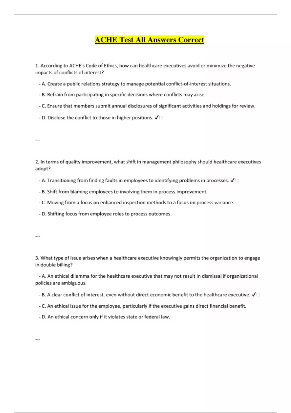 ACHE Test All Answers Correct 1. According to ACHE's Code of Ethics, how can healthcare executives avoid or minimize the negative impacts of conflicts of interest? - A. Create a public relations strategy to manage potential conflict-of-interest situations. - B. Refrain from participating in specific decisions where conflicts may arise. - C. Ensure that members submit annual disclosures of significant activities and holdings for review. - D. Disclose the conflict to those in higher positions. ️ --- 2. In terms of quality improvement, what shift in management philosophy should healthcare executives adopt? - A. Transitioning from finding faults in employees to identifying problems in processes. ️ - B. Shift from blaming employees to involving them in process improvement. - C. Moving from a focus on enhanced inspection methods to a focus on process variance. - D. Shifting focus from employee roles to process outcomes. --- 3. What type of issue arises when a healthcare executive knowingly permits the organization to engage in double billing? - A. An ethical dilemma for the healthcare executive that may not result in dismissal if organizational policies are ambiguous. - B. A clear conflict of interest, even without direct economic benefit to the healthcare executive. ️ - C. An ethical issue for the employee, particularly if the executive gains direct financial benefit. - D. An ethical concern only if it violates state or federal law. --- 4. Which unit of measurement is commonly used to assess physicians' clinical productivity? - A. RVU (Relative Value Unit) ️ - B. CMS (Centers for Medicare & Medicaid Services) - C. IPO (Initial Public Offering)