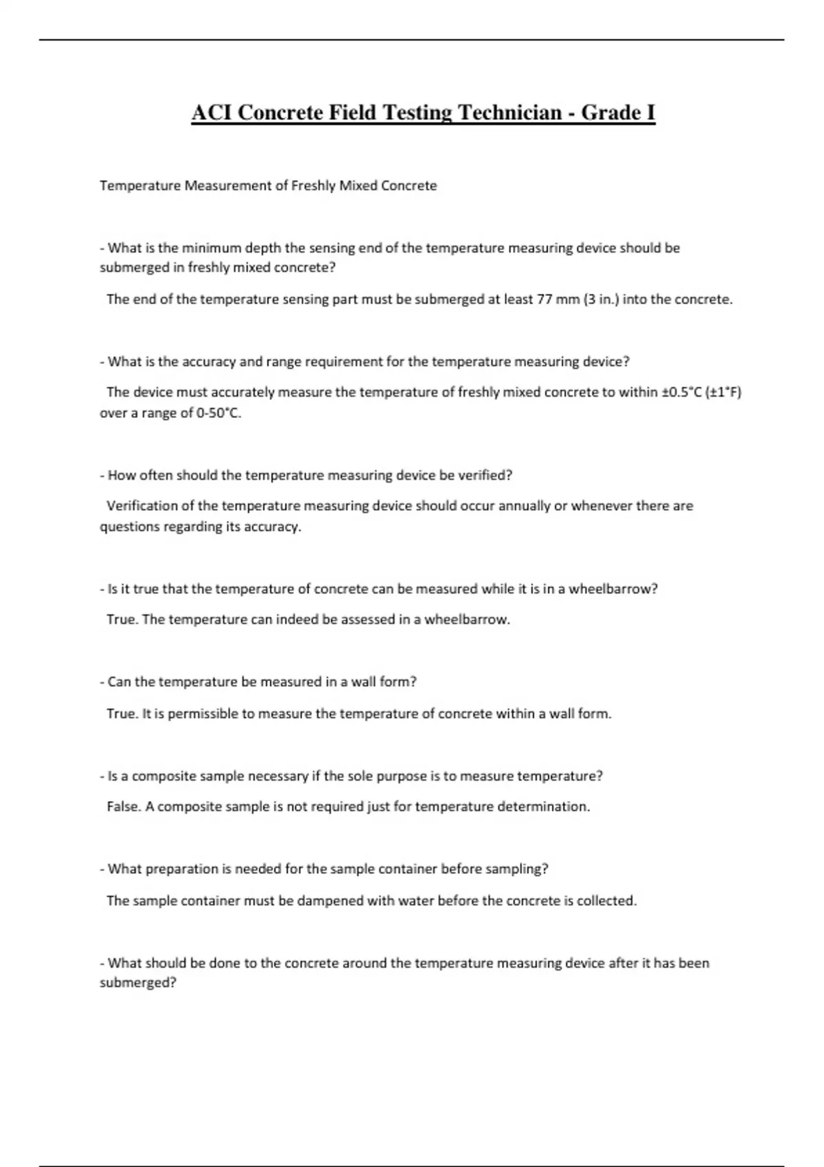 ACI Concrete Field Testing Technician - Grade I Temperature Measurement of Freshly Mixed Concrete - What is the minimum depth the sensing end of the temperature measuring device should be submerged in freshly mixed concrete? The end of the temperature sensing part must be submerged at least 77 mm (3 in.) into the concrete. - What is the accuracy and range requirement for the temperature measuring device? The device must accurately measure the temperature of freshly mixed concrete to within ±0.5°C (±1°F) over a range of 0-50°C. - How often should the temperature measuring device be verified? Verification of the temperature measuring device should occur annually or whenever there are questions regarding its accuracy. - Is it true that the temperature of concrete can be measured while it is in a wheelbarrow? True. The temperature can indeed be assessed in a wheelbarrow. - Can the temperature be measured in a wall form? True. It is permissible to measure the temperature of concrete within a wall form. - Is a composite sample necessary if the sole purpose is to measure temperature? False. A composite sample is not required just for temperature determination. - What preparation is needed for the sample container before sampling? The sample container must be dampened with water before the concrete is collected. - What should be done to the concrete around the temperature measuring device after it has been submerged? The concrete at the surface around the device should be gently pressed to ensure proper contact. - For how long must the temperature measuring device stay in the concrete for accurate measurement? The device should remain in the freshly mixed concrete for at least 2 minutes, but no more than 5 minutes. - What must be done after the concrete temperature is measured? The temperature must be reported following the measurement. - To what degree of precision should the concrete temperature be recorded? The temperature is reported to the nearest 1 degree Fahrenheit. - What is one reason given in ASTM C1064 for measuring concrete’s temperature? One key reason is to verify compliance with specific requirements. - Does ASTM C1064 specify a maximum allowable temperature for freshly mixed concrete? False. There is no maximum temperature limit specified in ASTM C1064. - Is it correct that a sample of concrete used for temperature evaluation must be rodded 25 times? False. There is no requirement for the sample to be rodded 25 times for temperature measurement. Sampling Procedures for Freshly Mixed Concrete - What is the purpose of sampling according to ASTM C172? The methods included aim to obtain representative samples for testing compliance with quality requirements of the relevant specifications. - From what types of mixers does this method cover sampling procedures? It applies to stationary mixers, paving mixers, revolving drum mixers, and open top mixers. - What is the maximum time allowed between taking the first and last portions of a composite sample? The elapsed time between these two portions must not exceed 15 minutes. - Should portions of a composite sample be mixed thoroughly before testing? True. Thorough mixing is required before any tests are conducted on the sample. - How quickly should tests for slump, temperature, and air content begin after taking the final portion of the composite sample? Tests should start within 5 minutes after obtaining the final portion. - When should specimen molding for strength tests commence after preparing the composite sample? Molding of the specimens must begin within 15 minutes after the composite sample is fabricated. - What precautions should be taken regarding the concrete sample? The sample must be protected from contamination and rapid evaporation. - What is the maximum volume for a concrete sample used in making strength test specimens? The minimum size required for strength test specimens is 1 cubic foot. - How many times should a batch from a stationary mixer be sampled during discharge? A batch must be sampled at two or more regularly spaced intervals during the discharge of its middle portion. When sampling from a PAVING mixer, obtain samples from at least __ different portions of the pile and combine them into one composite sample for test purposes 5 When sampling from a REVOLVING DRUM TRUCK mixer, sample the concrete by collecting __ or more portions taken at regularly spaced intervals during discharge of the middle portion of the batch. 2 Concrete samples from a truck mixer will be obtained before any water or admixtures are added to the