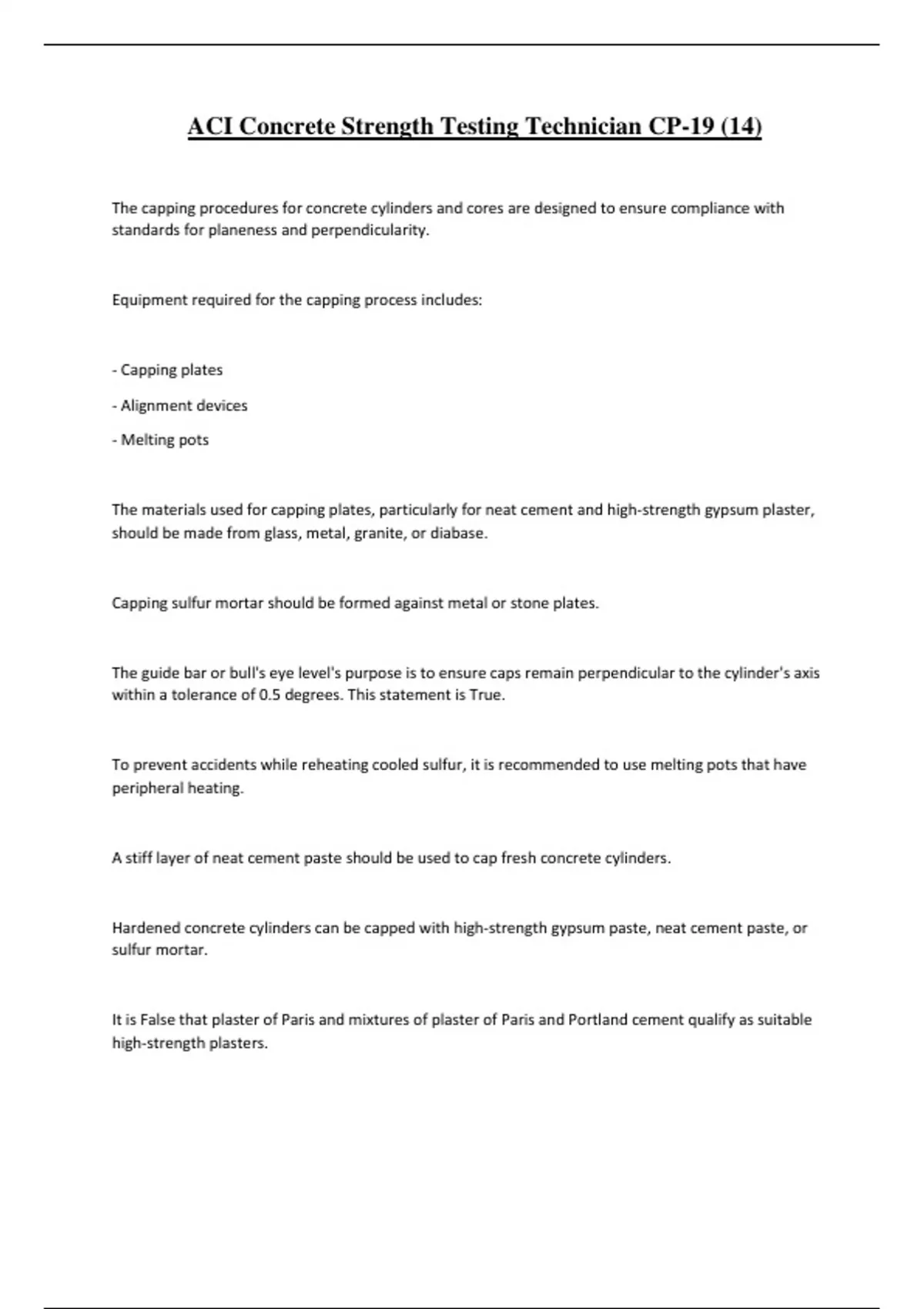ACI Concrete Strength Testing Technician CP-19 (14) The capping procedures for concrete cylinders and cores are designed to ensure compliance with standards for planeness and perpendicularity. Equipment required for the capping process includes: - Capping plates - Alignment devices - Melting pots The materials used for capping plates, particularly for neat cement and high-strength gypsum plaster, should be made from glass, metal, granite, or diabase. Capping sulfur mortar should be formed against metal or stone plates. The guide bar or bull's eye level's purpose is to ensure caps remain perpendicular to the cylinder's axis within a tolerance of 0.5 degrees. This statement is True. To prevent accidents while reheating cooled sulfur, it is recommended to use melting pots that have peripheral heating. A stiff layer of neat cement paste should be used to cap fresh concrete cylinders. Hardened concrete cylinders can be capped with high-strength gypsum paste, neat cement paste, or sulfur mortar. It is False that plaster of Paris and mixtures of plaster of Paris and Portland cement qualify as suitable high-strength plasters. Sulfur mortars and high-strength gypsum cement cubes must achieve a minimum compressive strength of 35 MPa (5000 psi) or correspond to the cylinder strength, whichever is greater. The cement paste should be applied to freshly molded cylinders between 2 to 4 hours after molding to allow for the settling of the concrete specimen. The strength of the paste is influenced by: a) the water-cement ratio b) time d) type of cement Thus, the correct factors influencing strength are a, b, and d. When placing the capping plate onto the mound of the paste, a slight twisting motion aids in removing excess paste and air voids. Neat cement paste caps are inadvisable for dry specimens, as they may shrink and crack when dry. Before capping, the technician should ensure that all oily or waxy materials are removed from the ends of hardened concrete cylinders. The pot should be emptied and recharged with fresh material at intervals to ensure that no material has been used more than 5 times. When capping concrete cylinders with a compressive strength of 35 MPa (5000 psi) or higher, it is False that one can reuse material from old caps. To prevent foaming, sulfur mortar must be dry before adding to the pot and should be kept away from water during heating. The melting pot for the sulfur mortar must be situated underneath a hood equipped with an exhaust fan for ventilation. Hydrogen sulfide gas, which may be released during the capping process, can be lethal and cause symptoms such as nausea, stomach distress, dizziness, headaches, and eye irritation. When qualification tests of unbonded pads are required, they are performed by the _____ or _____. ️Supplier, user This standard (ASTM 1231) established a maximum number of pad reuses that may not be exceeded
