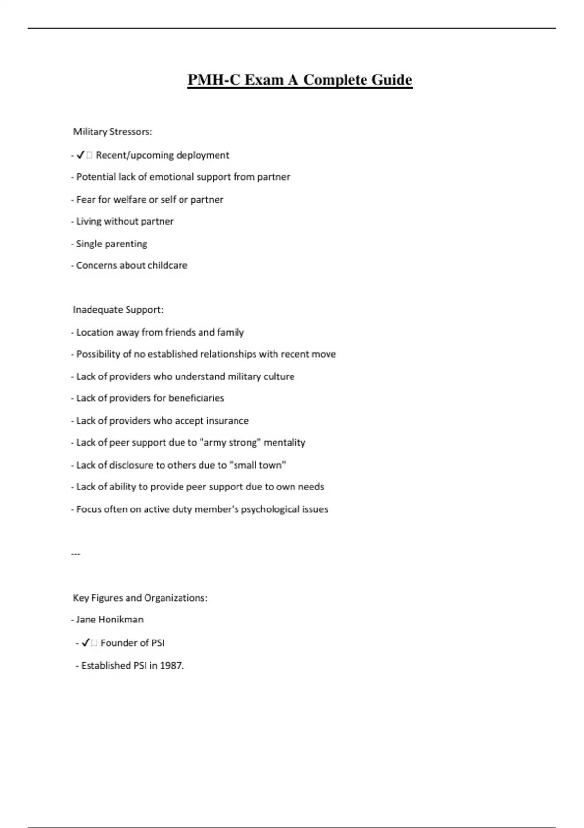 PMH-C Exam A Complete Guide Military Stressors: - ️ Recent/upcoming deployment - Potential lack of emotional support from partner - Fear for welfare or self or partner - Living without partner - Single parenting - Concerns about childcare Inadequate Support: - Location away from friends and family - Possibility of no established relationships with recent move - Lack of providers who understand military culture - Lack of providers for beneficiaries - Lack of providers who accept insurance - Lack of peer support due to "army strong" mentality - Lack of disclosure to others due to "small town" - Lack of ability to provide peer support due to own needs - Focus often on active duty member's psychological issues --- Key Figures and Organizations: - Jane Honikman - ️ Founder of PSI - Established PSI in 1987. - Louis Victor Marce - ️ French psychiatrist who wrote the first treatise on puerperal mental illness. - James A. Hamilton - ️ Father of Postpartum Psychiatric Illness - Authored Postpartum Psychiatric Problems - Founded the Marce Society - Advocate for research, treatment, and social support. --- Organizations: - DAD: Depression After Delivery (USA) - APNI: Association for Post Natal Illness (England) - PANDA: Post and Ante Natal Depression Association (Australia) - Postpartum Education for Parents: Postpartum Education for Parents (USA) --- Mental Health Facts: - Most important part of mental health for women, children, and families: ️ Social support - Number of countries PSI has members in: ️ Over 40 countries - Percentage of women who will experience postpartum depression: ️ 21% - Percentage of pregnant women experiencing moderate to severe symptoms of depression and/or anxiety: ️ 20% - Percentage of pregnant women with psychiatric diagnosis who were treated: ️ Less than 86% - Percentage of women on antidepressants who were symptomatic due to suboptimal treatment: ️ Over 50% - Definition of perinatal period: ️ The entire time frame from pregnancy through the first year after giving birth - Definition of PMAD: ️ Perinatal Mood (depression and bipolar) Anxiety (GAD, panic, OCD, PTSD) Disorders - Percentage of unplanned pregnancies: ️ 50% - Definition of PMDD: ️ Premenstrual dysphoric disorder - Sensitive to hormonal changes; risk factor for PMAD. Disorders that classify as PMAD: - ️ Depression - ️ Anxiety and Panic disorder - ️ OCD - ️ PTSD - ️ Perinatal Bipolar - ️ Psychosis --- Impact of Perinatal Depression: - Most underdiagnosed obstetric complication in America. - Related issues include: - Increased costs of medical care - Inappropriate medical care - Child abuse and neglect - Discontinuation of breastfeeding - Family dysfunction - Adversely affects early brain development - Detection and diagnosis: ️ 40% of cases are detected and diagnosed - Treatment: ️ 60% receive treatment Prevalence Rates: - Prevalence for prenatal anxiety: ️ 15.8% - Prevalence for postpartum anxiety: ️ 8% - 20% - PMADs in fathers: ️ 1 in 10 men will experience anxiety/depression Fathers with higher ACE scores reported more pregnancy-related anxiety than did fathers with lower scores at all time points Reported more depressive feelings during pregnancy 9.2% had depression prenatally Maternal depression increased the risk of paternal depression - Initial high after birth may give way to depression - Masked male depression (substance use, irritable, aggressive) - Distancing - Distractions and habits Medication ️50-75% relapse (depression and anxiety) after discontinuing medication while pregnant Over 40% resume medication during pregnancy The benefit out weights the risk when on medication during pregnancy Normal Pregnancy symptoms ️Mood is labile, teary Self esteem is normal Sleep: bladder or heartburn may awaken. Can fall asleep No suicidal ideology Energy: may tire, rest restores Pleasure: joy and anticipation (appropriate worry) Appetite: increases Depression Symptoms ️Mood: persistent gloom Low self-esteem, guilt Sleep: early a.m. awakening Suicidal thoughts, plans, or intentions Energy: rest does not restore Fatigue Anhedonia Poor appetite Sadness, crying Guilt and shame Hopeless and helplessness Overwhelm Lack of feelings toward baby Isolation "This doesn't feel like me" Worthlessness Mood swings Inability to care for self and family baby blues ️-NOT a mild form of clinical depression - Affects 60-80% of new moms - Mild - Lasts no more than 2 days to 2 weeks