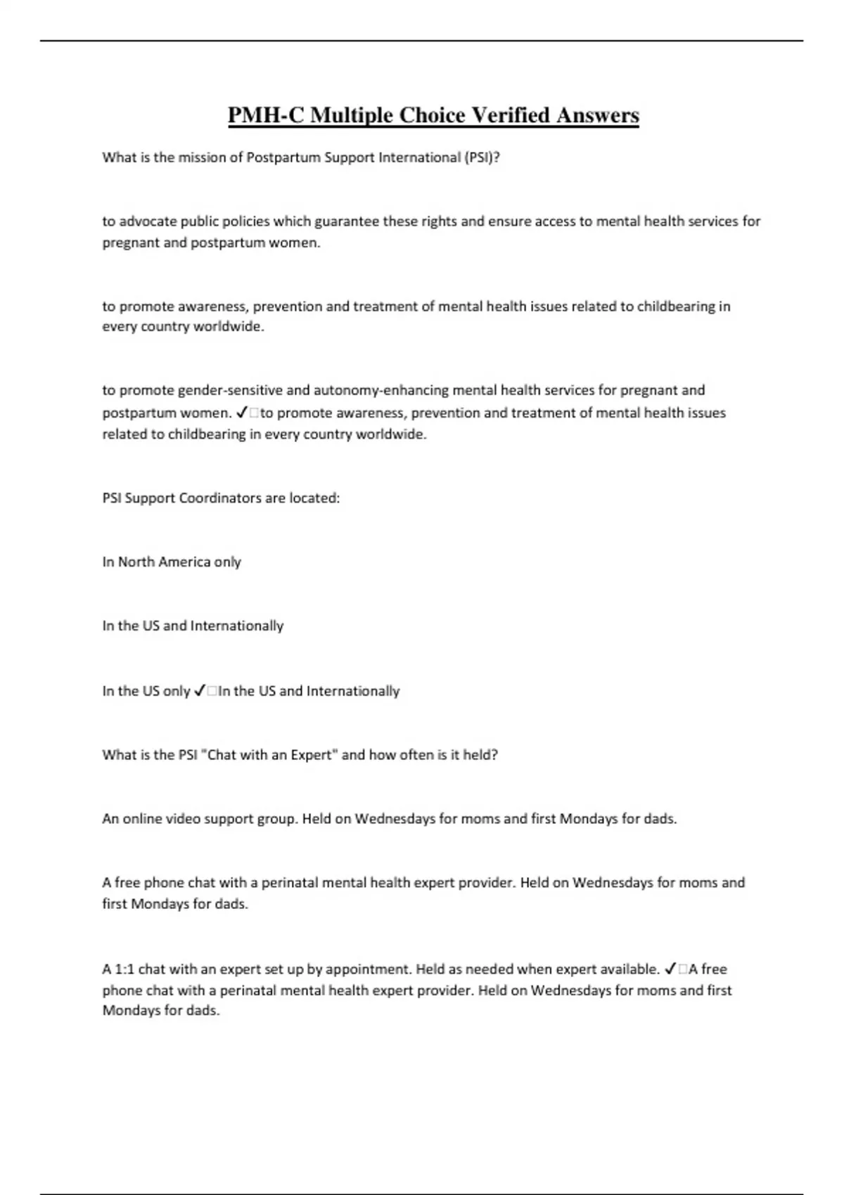 PMH-C Multiple Choice Verified Answers What is the mission of Postpartum Support International (PSI)? to advocate public policies which guarantee these rights and ensure access to mental health services for pregnant and postpartum women. to promote awareness, prevention and treatment of mental health issues related to childbearing in every country worldwide. to promote gender-sensitive and autonomy-enhancing mental health services for pregnant and postpartum women. ️to promote awareness, prevention and treatment of mental health issues related to childbearing in every country worldwide. PSI Support Coordinators are located: In North America only In the US and Internationally In the US only ️In the US and Internationally What is the PSI "Chat with an Expert" and how often is it held? An online video support group. Held on Wednesdays for moms and first Mondays for dads. A free phone chat with a perinatal mental health expert provider. Held on Wednesdays for moms and first Mondays for dads. A 1:1 chat with an expert set up by appointment. Held as needed when expert available. ️A free phone chat with a perinatal mental health expert provider. Held on Wednesdays for moms and first Mondays for dads. What is the toll-free "HelpLine" number operated by PSI? 1-877-944-HELP PPD 1-800-944-MAMA ️PPD What is the prevalence of postpartum depression in women, according to research by Kathy Wisner in 2012? (see assigned article) 1:5 in the first three months; 1:7 when subjects followed for the first year. 1:10 in the first three months; 1:7 when subjects followed for the first year. 1:7 in the first three months; 1:5 when subjects followed for the first year. ️1:7 in the first three months; 1:5 when subjects followed for the first year What was *NOT* a frequent co-occurring disorder with postpartum depression, according to Kathy Wisner's study? narcolepsy anxiety bipolar disorders ️narcolepsy What percentage of fathers experience depression postpartum, according to the American Academy of Pediatrics? 1:20 1:5 1:10 ️1:10 Which of the following is *NOT* recognized as a statistically-significant cause of a perinatal mental health disorder? Cesarean Birth Stress from living in poverty Thyroid imbalance ️Cesarean Birth Which if the following is *NOT* considered a recognized perinatal mental health disorder? Fatigue Perinatal Obsessive compulsive disorder Postpartum Psychosis ️Fatigue Who wrote that "trauma is in the eye of the beholder", regarding birth trauma? Cheryl Beck Judith Beck