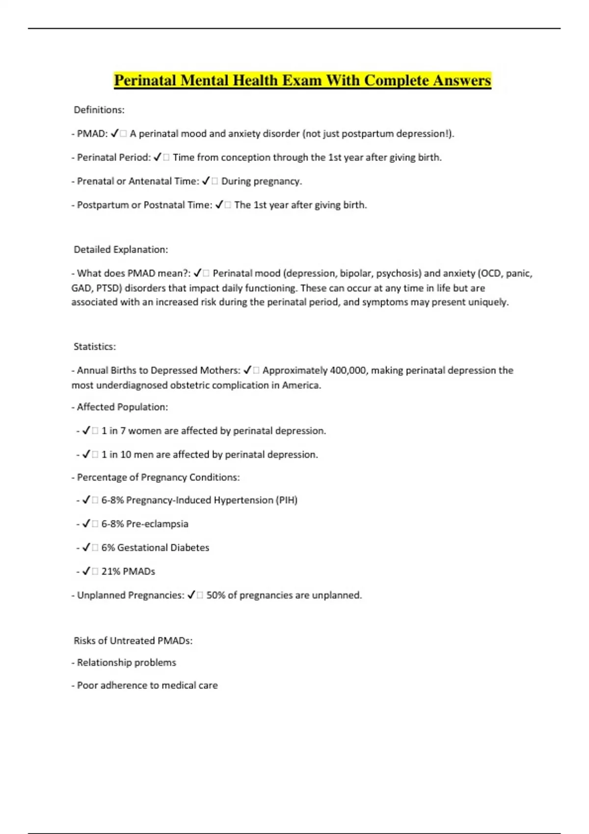 Perinatal Mental Health Exam With Complete Answers Definitions: - PMAD: ️ A perinatal mood and anxiety disorder (not just postpartum depression!). - Perinatal Period: ️ Time from conception through the 1st year after giving birth. - Prenatal or Antenatal Time: ️ During pregnancy. - Postpartum or Postnatal Time: ️ The 1st year after giving birth. Detailed Explanation: - What does PMAD mean?: ️ Perinatal mood (depression, bipolar, psychosis) and anxiety (OCD, panic, GAD, PTSD) disorders that impact daily functioning. These can occur at any time in life but are associated with an increased risk during the perinatal period, and symptoms may present uniquely. Statistics: - Annual Births to Depressed Mothers: ️ Approximately 400,000, making perinatal depression the most underdiagnosed obstetric complication in America. - Affected Population: - ️ 1 in 7 women are affected by perinatal depression. - ️ 1 in 10 men are affected by perinatal depression. - Percentage of Pregnancy Conditions: - ️ 6-8% Pregnancy-Induced Hypertension (PIH) - ️ 6-8% Pre-eclampsia - ️ 6% Gestational Diabetes - ️ 21% PMADs - Unplanned Pregnancies: ️ 50% of pregnancies are unplanned. Risks of Untreated PMADs: - Relationship problems - Poor adherence to medical care - Exacerbation of chronic medical issues - Loss of financial resources - Disability - Child neglect/abuse - Developmental delays - Increased use of tobacco/alcohol/drugs - Potential for suicide or homicide Etiology of Postpartum Depression (PPD): - Genetic predisposition - Biological sensitivity to hormonal changes - Social/environmental factors (history of trauma, poor social support) - Psychological aspects (relationship with own mother, self-image, perfectionism) Cultural Considerations: - In some cultures, mothers may not feel safe to express their needs or seek help. - Symptoms may be reported differently based on cultural perspectives. Landmark Study on PPD: - ️ 22% of women had depression during the first year postpartum. - 26% started before pregnancy - 33% developed during pregnancy - 40% experienced it postpartum - Of the 22% of postpartum mothers: - ️ 68% had unipolar depression - ️ 66% had Major Depressive Disorder (MDD) or a combination with Generalized Anxiety Disorder (GAD) - ️ 22% had bipolar depression - ️ 19% had thoughts of self-harm Relapse Rates: - Prenatal Depression Relapse Rates: - ️ 26% of those who continued medication relapsed during pregnancy.