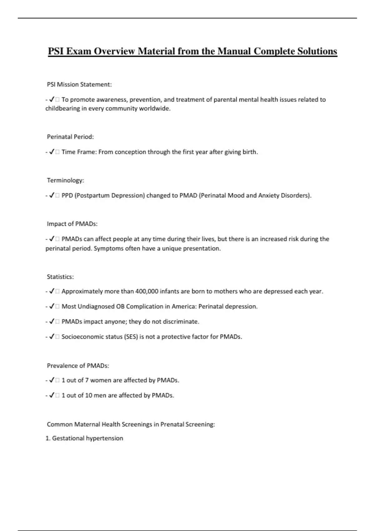 PSI Exam Overview Material from the Manual Complete Solutions PSI Mission Statement: - ️ To promote awareness, prevention, and treatment of parental mental health issues related to childbearing in every community worldwide. Perinatal Period: - ️ Time Frame: From conception through the first year after giving birth. Terminology: - ️ PPD (Postpartum Depression) changed to PMAD (Perinatal Mood and Anxiety Disorders). Impact of PMADs: - ️ PMADs can affect people at any time during their lives, but there is an increased risk during the perinatal period. Symptoms often have a unique presentation. Statistics: - ️ Approximately more than 400,000 infants are born to mothers who are depressed each year. - ️ Most Undiagnosed OB Complication in America: Perinatal depression. - ️ PMADs impact anyone; they do not discriminate. - ️ Socioeconomic status (SES) is not a protective factor for PMADs. Prevalence of PMADs: - ️ 1 out of 7 women are affected by PMADs. - ️ 1 out of 10 men are affected by PMADs. Common Maternal Health Screenings in Prenatal Screening: 1. Gestational hypertension 2. Pre-eclampsia 3. Gestational diabetes 4. PMADs Prenatal Screening Percentages: - ️ Gestational Hypertension: 6-8% - ️ Pre-eclampsia: 6-8% - ️ Gestational Diabetes: 6% - ️ PMADs: 21% PSI Memorial Quilt: - ️ Established in 2002 to honor the memory of women and children who died as a result of postpartum mood disorders. Costs and Risks of Untreated PMADs: - ️ Cost of Untreated PMADs: Leads to increased costs of medical care, inappropriate medical care, child abuse and neglect, discontinuation of breastfeeding, family dysfunction, and adverse effects on early brain development. Risks of Untreated PMADs: - ️ Relationship problems - ️ Poor adherence to medical care - ️ Exacerbation of medical conditions - ️ Intimate partner violence (IPV), separation, divorce - ️ Loss of interpersonal and financial resources - ️ Disability/unemployment - ️ Child neglect and abuse - ️ Developmental delays/behavioral problems - ️ Increased use of tobacco, alcohol, illicit drugs - ️ Infanticide/homicide/suicide Unplanned Pregnancies: - ️ Approximately 50% of pregnancies are unplanned. Assumptions About Pregnancy: - ️ All pregnancies are planned. - ️ Getting pregnant is easy/hard. - ️ All pregnancies are wanted. - ️ Pregnancy = live baby, love in the relationship, healthy baby, fulfillment. What are some assumptions about labor and delivery? ️- Strong women don't need medication; - The only "good" birth is a "natural", non medicated one, - You've failed if you had a c section; - I will instantly bond with my baby What are some assumptions of Motherhood? ️- Being a mother is instinctual; - breastfeeding will come easily and naturally; - I will find time for me; - Good mother's don't take breaks; - I won't need anyone. - The baby will sleep all the time; - I will be a superwoman What are some assumptions of fathers and partners? ️- We are supposed to be "the r