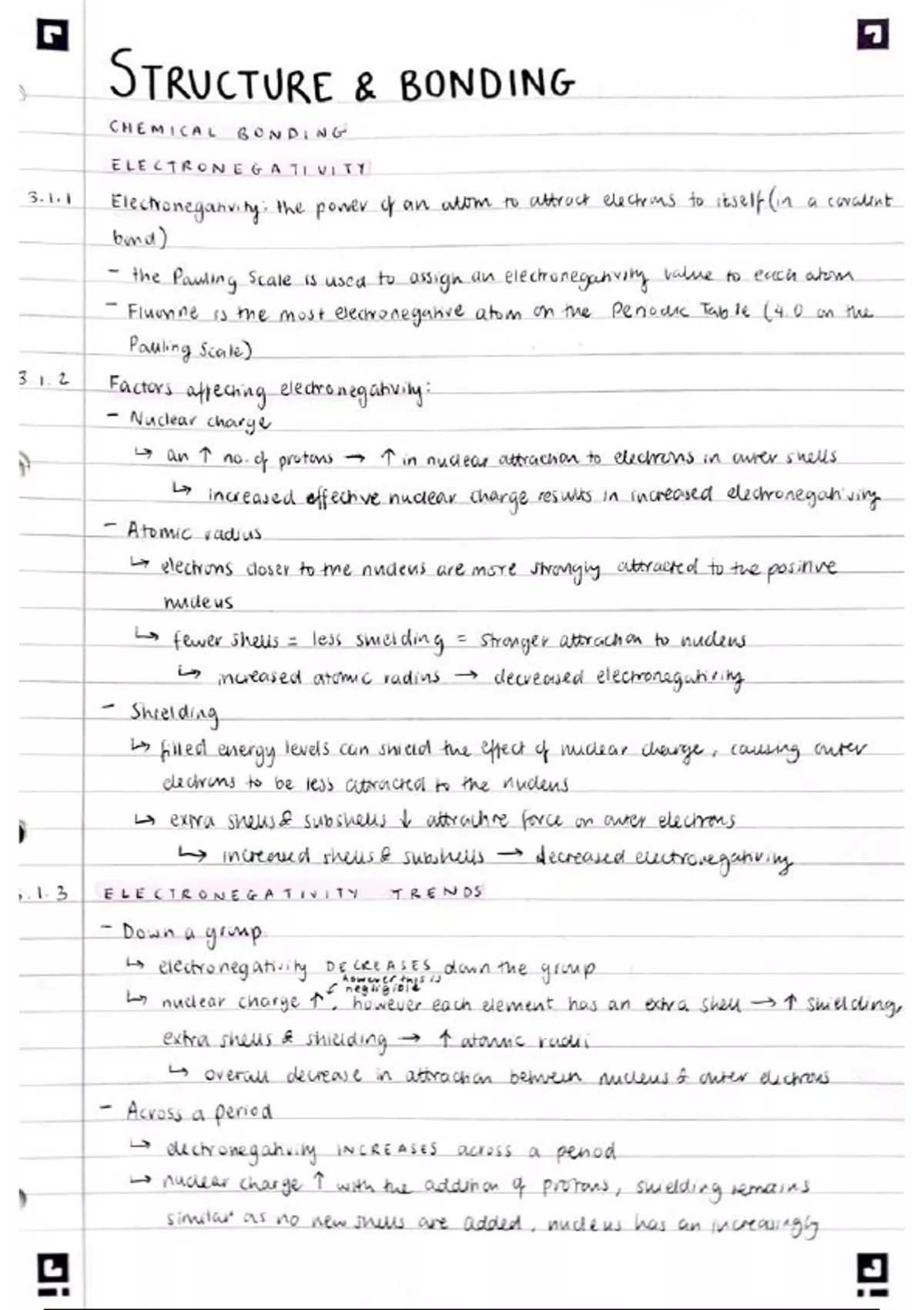 A concise, handwritten PDF of notes on Structure and Bonding for CIE A Level Chemistry that closely follows the points on the specification for examination in 2023. There are clear subheadings and dot and cross diagrams for illustration of ideas.