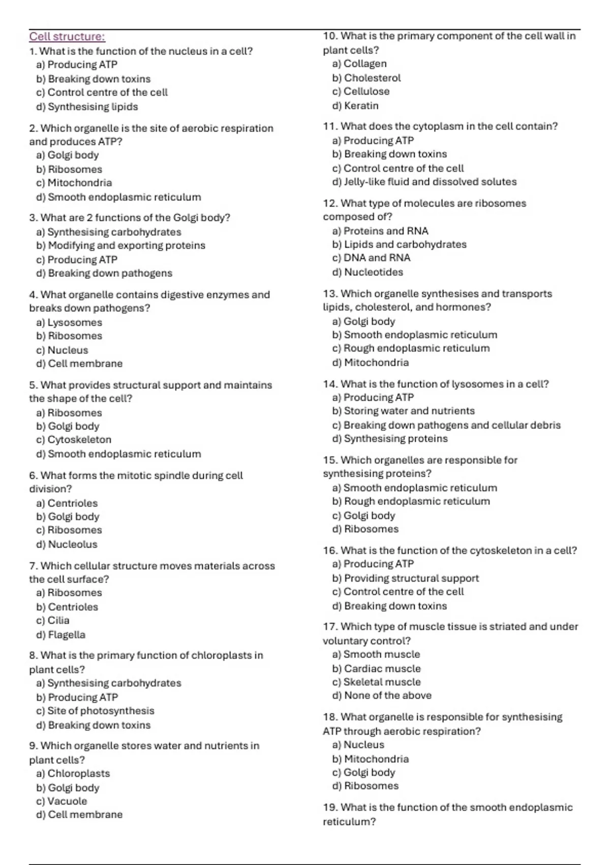 2. Which organelle is the site of aerobic respiration 11. What does the cytoplasm in the cell contain?