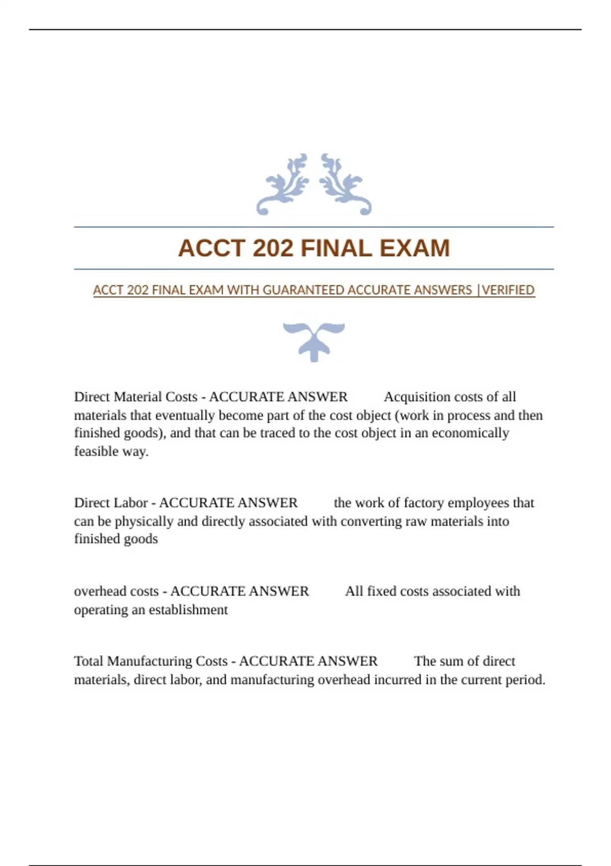 ACCT 202 FINAL EXAM ACCT 202 FINAL EXAM WITH GUARANTEED ACCURATE ANSWERS |VERIFIED Direct Material Costs - ACCURATE ANSWERAcquisition costs of all materials that eventually become part of the cost object (work in process and then finished goods), and that can be traced to the cost object in an economically feasible way. Direct Labor - ACCURATE ANSWERthe work of factory employees that can be physically and directly associated with converting raw materials into finished goods overhead costs - ACCURATE ANSWERAll fixed costs associated with operating an establishment Total Manufacturing Costs - ACCURATE ANSWERThe sum of direct materials, direct labor, and manufacturing overhead incurred in the current period. Plantwide overhead rate method - ACCURATE ANSWERA method of assigning overhead costs to a product using a single overhead rate Advantages of ABC overhead rate method - ACCURATE ANSWER-More Effective and accurate overhead cost control and allocation. -Additional Uses (more than production costs) Disadvantages of ABC overhead rate method - ACCURATE ANSWERABC is no