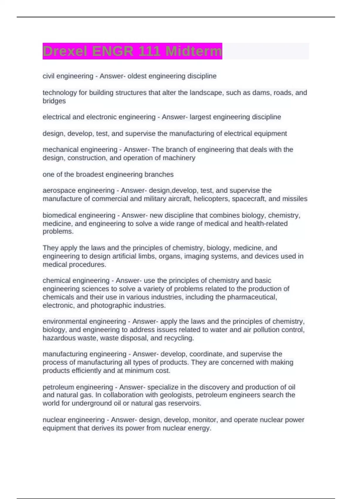 Drexel ENGR 111 Midterm civil engineering - Answer- oldest engineering discipline technology for building structures that alter the landscape, such as dams, roads, and bridges electrical and electronic engineering - Answer- largest engineering discipline design, develop, test, and supervise the manufacturing of electrical equipment mechanical engineering - Answer- The branch of engineering that deals with the design, construction, and operation of machinery one of the broadest engineering branches aerospace engineering - Answer- design,develop, test, and supervise the manufacture of commercial and military aircraft, helicopters, spacecraft, and missiles biomedical engineering - Answer- new discipline that combines biology, chemistry, medicine, and engineering to solve a wide range of medical and health-related problems. They apply the laws and the principles of chemistry, biology, medicine, and engineering to design artificial limbs, organs, imaging systems, and devices used in medical procedures. chemical engineering - Answer- use the principles of chemistry and basic engineering sciences to solve a variety of problems related to the production of chemicals and their use in various industries, including the pharmaceutical, electronic, and photographic industries. environmental engineering - Answer- apply the laws and the principles of chemistry, biology, and engineering to address issues related to water and air pollution control, hazardous waste, waste disposal, and recycling. manufacturing engineering - Answer- develop, coordinate, and supervise the process of manufacturing all types of products. They are concerned with making products efficiently and at minimum cost. petroleum engineering - Answer- specialize in the discovery and production of oil and natural gas. In collaboration with geologists, petroleum engineers search the world for underground oil or natural gas reservoirs. nuclear engineering - Answer- design, develop, monitor, and operate nuclear power equipment that derives its power from nuclear energy.