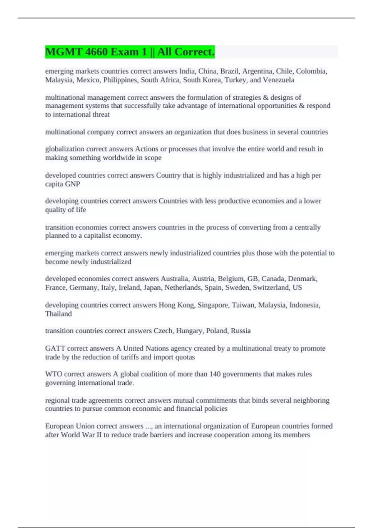GATT correct answers A United Nations agency created by a multinational treaty to promote