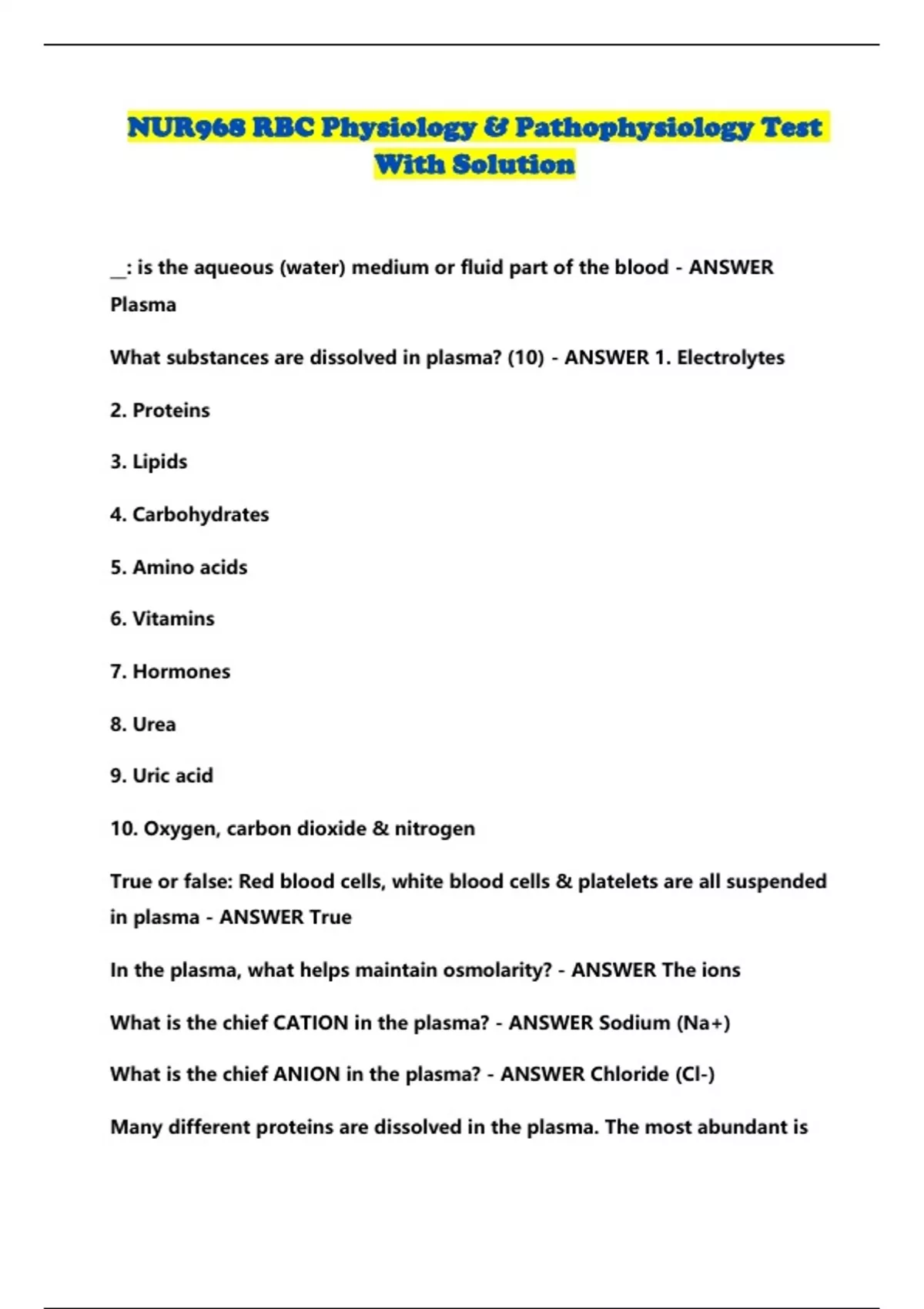 NUR968 RBC Physiology & Pathophysiology Test With Solution