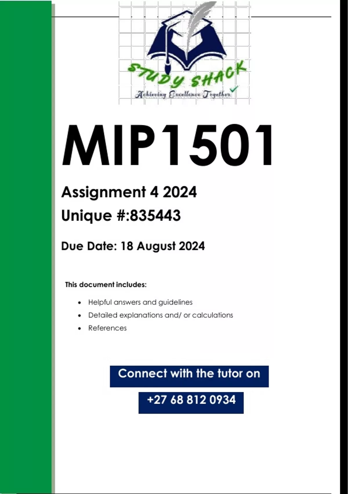 This document contains workings, explanations and solutions to the MIP1501 Assignment 4 (QUALITY ANSWERS) 2024. For assistance whats-app us on 0.6.8..8.1.2..0.9.3.4... Question 1 (30) 1.1. Explain in detail to an Intermediate Phase learner the difference between real and non-real numbers, give two examples for each. (8) 1.2. Explain in detail to an Intermediate Phase learner the difference between rational and irrational numbers, give two examples for each. (8) 1.3. Discuss in detail so that an Intermediate Phase learner will understand any four special facts to remember about the number zero. (8) 1.4. Briefly discuss the importance of absolute values so that Grade 6 learners would understand why absolute values are necessary, also give 2 examples. (6) Question 2 (30) 2.1. Design your own equations on distributive property (two equations) and associative property (two equations) and explain it to Grade 4 learners by giving solutions to each. (12) 2.2. You are just appointed as a Grade 4 mathematics teacher. What would you do to remediate if the learner has not fully developed non-symbolic counting skills? Briefly explain by giving examples. (6) 2.3. Reflect on your own knowledge and experience of rate. 2.3.1. Define rate using your own words and give three (2) examples of how rate is applied in real life. (6) 2.3.2. Use your examples given in 2.3.1. to explain in detail to a grade 6 learner the importance of rate in daily life. (6) Question 3 (24) 3.1. Complete the table below: Situation Reasoning Number sentence John and Lerato each join a gym. John’s gym asks a R140 deposit, and he pays R110 monthly. Lerato’s gym asks no deposit, but his monthly payment is R150. They compare their total payments after four months, after five months and after six months. 3.1.1. 3.1.2. (12) 3.2. Discus and give two (2) examples in each of the following building blocks which are crucial steps in building relational skills: 3.2.1. Making one-to-one correspondence (4) 3.2.2. Classification (4) 3.2.3. Cardinal and ordinal numbers (4) Question 4 (16) 4.1. List and briefly explain five possible challenges that can hinders a school or teachers to effectively use technology for teaching and learning in the Intermediate Phase (10) 4.2. Discuss in detail and give three examples on how the use of a calculator can enhance Intermediate Phase learners’ understanding of mathematical concepts. (6)