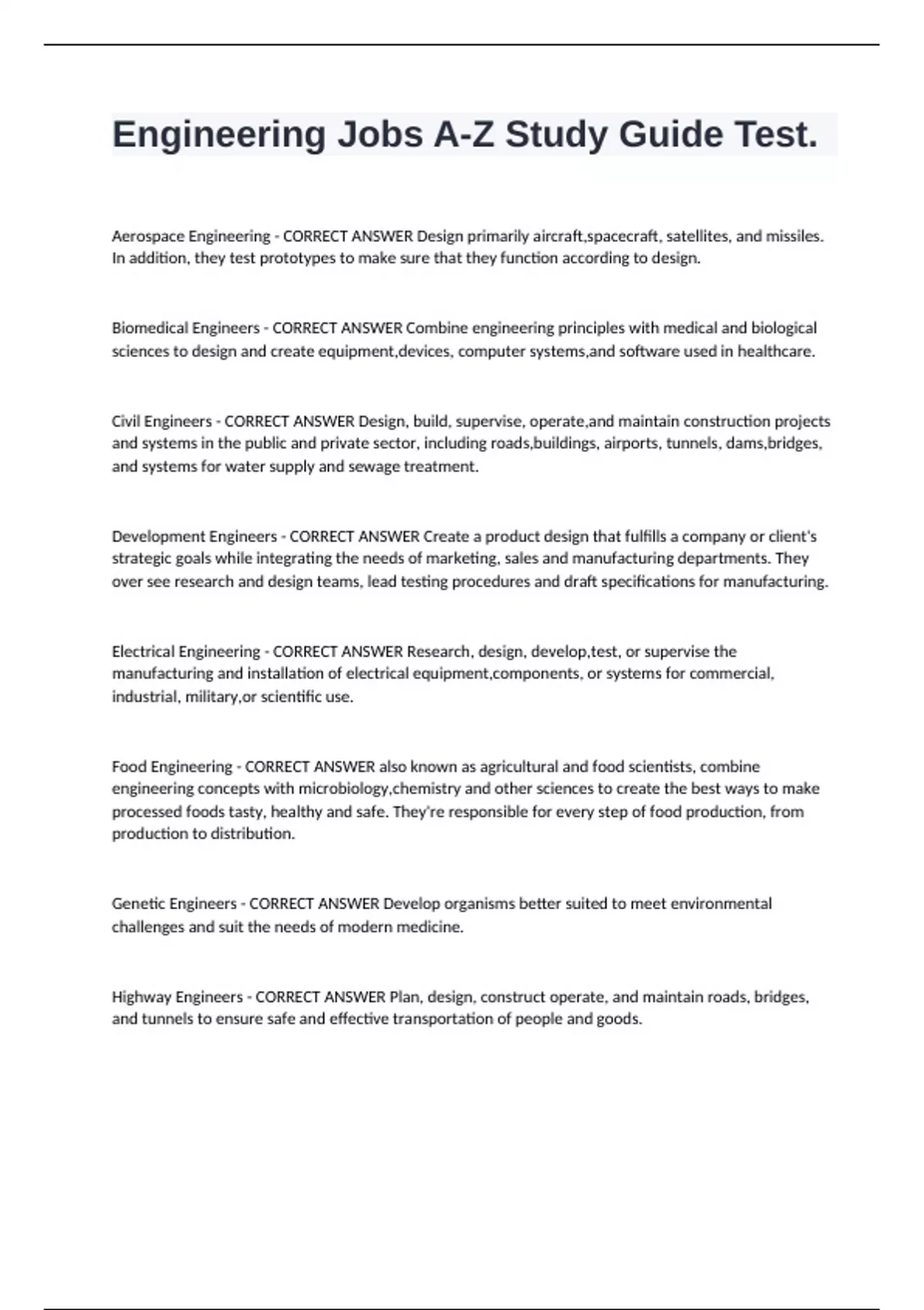 Engineering Jobs A-Z Study Guide Test. Aerospace Engineering - CORRECT ANSWER Design primarily aircraft,spacecraft, satellites, and missiles. In addition, they test prototypes to make sure that they function according to design. Biomedical Engineers - CORRECT ANSWER Combine engineering principles with medical and biological sciences to design and create equipment,devices, computer systems,and software used in healthcare. Civil Engineers - CORRECT ANSWER Design, build, supervise, operate,and maintain construction projects and systems in the public and private sector, including roads,buildings, airports, tunnels, dams,bridges, and systems for water supply and sewage treatment. Development Engineers - CORRECT ANSWER Create a product design that fulfills a company or client's strategic goals while integrating the needs of marketing, sales and manufacturing departments. They over see research and design teams, lead testing procedures and draft specifications for manufacturing. Electrical Engineering - CORRECT ANSWER Research, design, develop,test, or supervise the manufacturing and installation of electrical equipment,components, or systems for commercial, industrial, military,or scientific use.