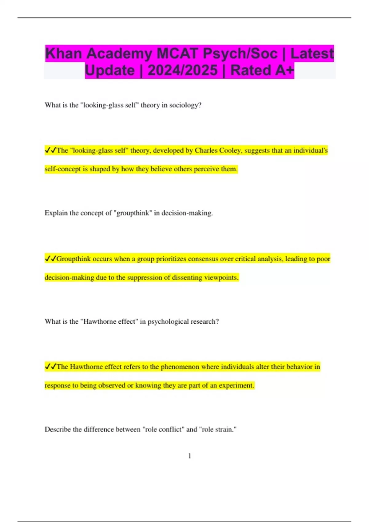 Khan Academy MCAT Psych/Soc | Latest Update | 2024/2025 | Rated A+ What is the "looking-glass self" theory in sociology? The "looking-glass self" theory, developed by Charles Cooley, suggests that an individual's self-concept is shaped by how they believe others perceive them. Explain the concept of "groupthink" in decision-making. Groupthink occurs when a group prioritizes consensus over critical analysis, leading to poor decision-making due to the suppression of dissenting viewpoints. What is the "Hawthorne effect" in psychological research? The Hawthorne effect refers to the phenomenon where individuals alter their behavior in response to being observed or knowing they are part of an experiment. Describe the difference between "role conflict" and "role strain." 2 Role conflict occurs when an individual faces incompatible demands from different social roles, while role strain arises from competing demands within the same role. What is the significance of "social capital" in sociology? Social capital refers to the resources and benefits individuals gain from their social networks and relationships, which can enhance opportunities and support within a community. Explain "cognitive dissonance" and how it affects behavior. Cognitive dissonance is the mental discomfort experienced when holding contradictory beliefs or attitudes, often leading individuals to change their attitudes or behaviors to reduce the inconsistency. What is the concept of "stereotype threat," and how does it impact performance? 3 Stereotype threat occurs when individuals fear confirming negative stereotypes about their social group, which can lead to anxiety and reduced performance in situations where the stereotype is relevant. Describe the "socioeconomic gradient in health" and its implications. The socioeconomic gradient in health refers to the observation that individuals with lower socioeconomic status tend to have worse health outcomes, highlighting the impact of social and economic factors on health. What is "ethnocentrism," and how