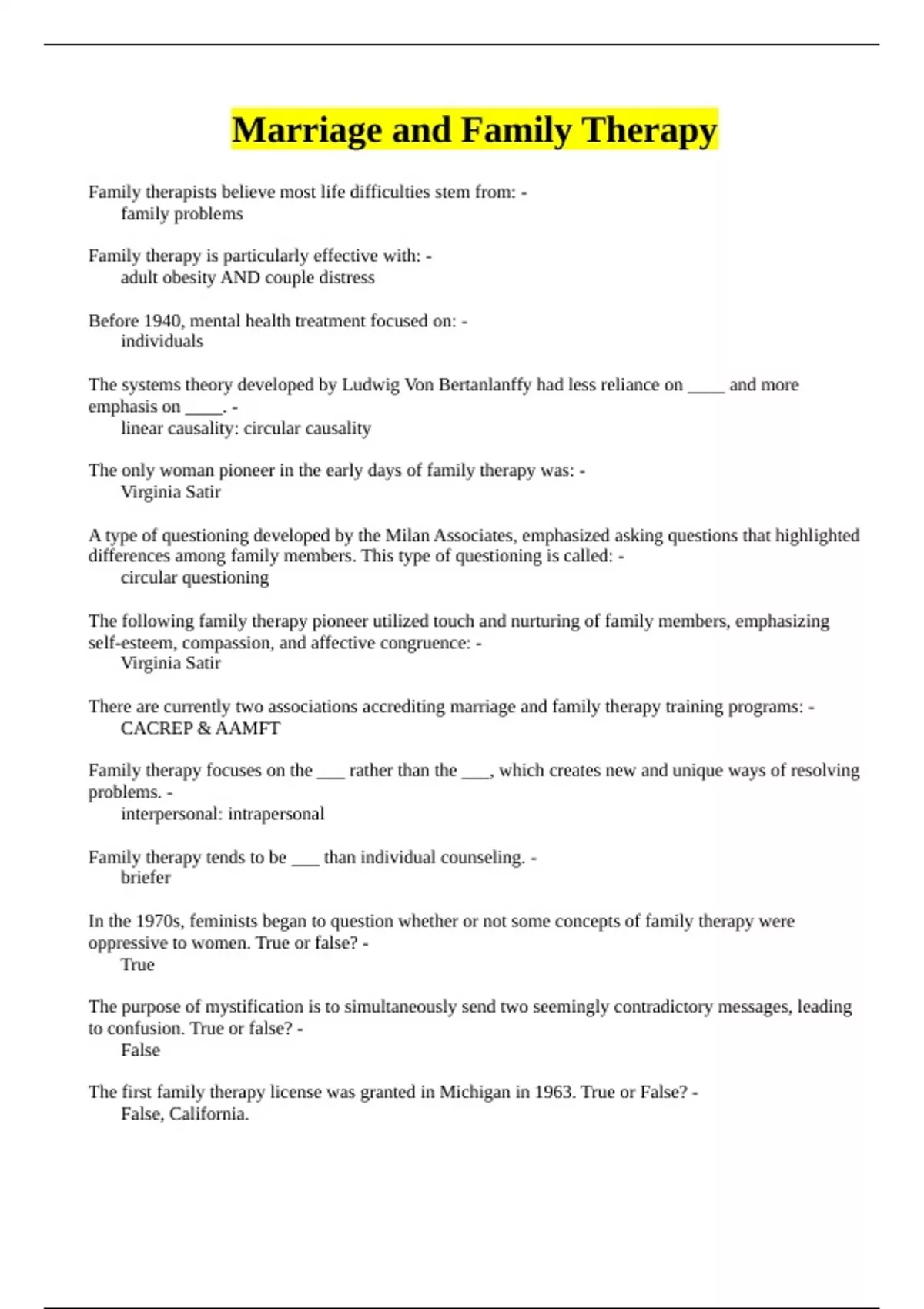 Marriage and Family T Family therapists believe most life difficulties stem from: - family problems Family therapy is particularly effective with: - adult obesity AND couple distress Before 1940, mental health treatment focused on: - individuals The systems theory developed by Ludwig Von Bertanlanffy had less reliance on ____ and more emphasis on ____. - linear causality: circular causality The only woman pioneer in the early days of family therapy was: - Virginia Satir