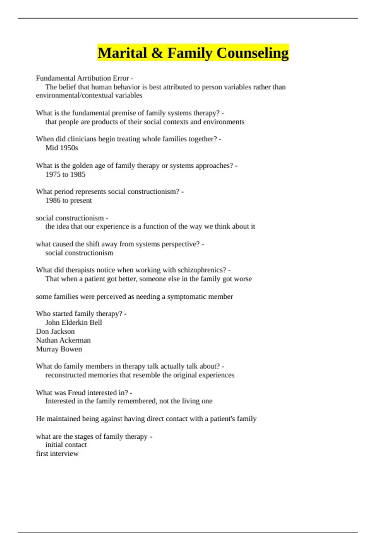 Fundamental Arrtibution Error - The belief that human behavior is best attributed to person variables rather than environmental/contextual variables What is the fundamental premise of family systems therapy? - that people are products of their social contexts and environments When did clinicians begin treating whole families together? - Mid 1950s What is the golden age of family therapy or systems approaches? - 1975 to 1985 What period represents social constructionism? - 1986 to present