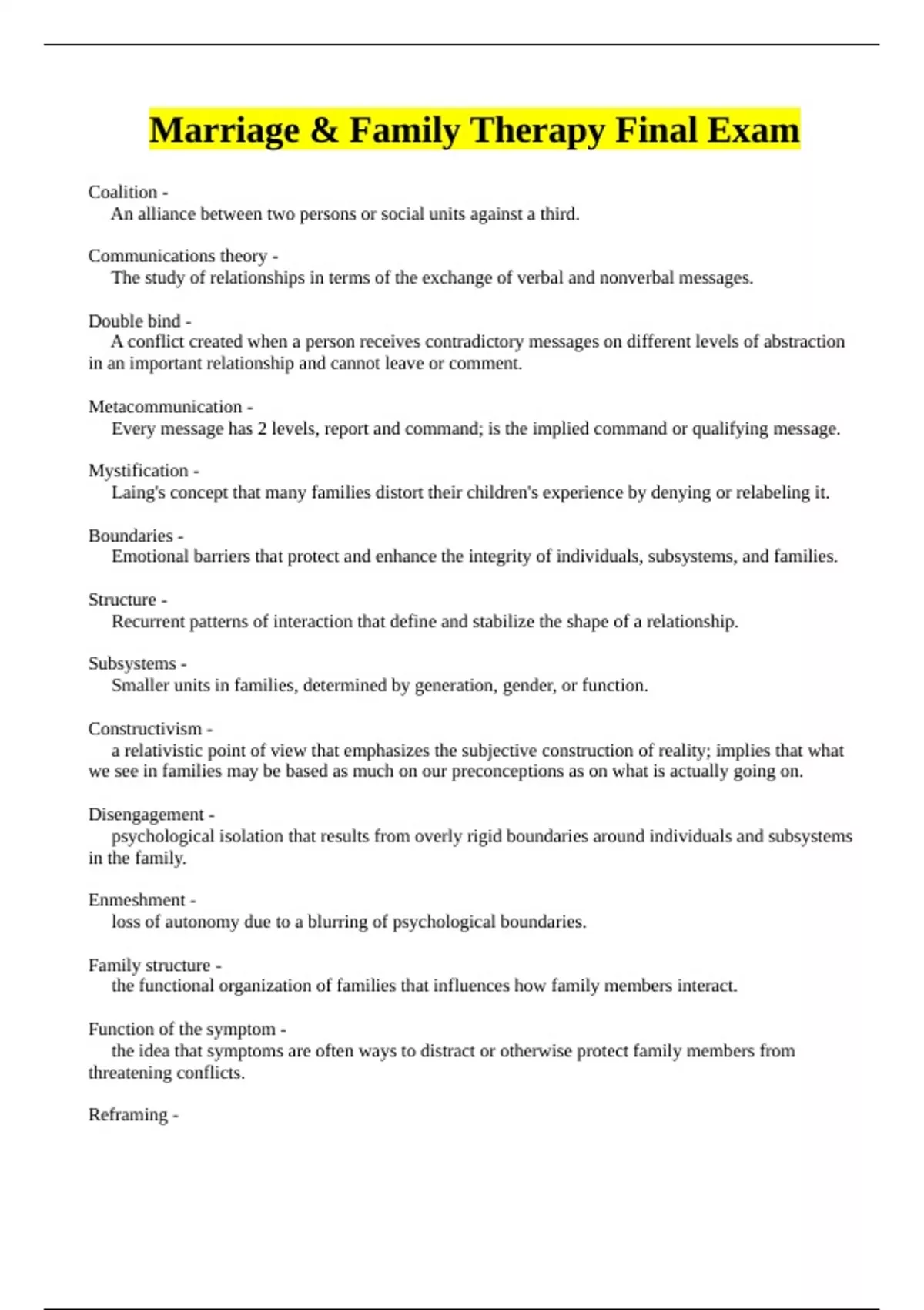 Marriage & Family Therapy Final ECoalition - An alliance between two persons or social units against a third. Communications theory - The study of relationships in terms of the exchange of verbal and nonverbal messages. Double bind - A conflict created when a person receives contradictory messages on different levels of abstraction in an important relationship and cannot leave or comment. Metacommunication - Every message has 2 levels, report and command; is the implied command or qualifying message. Mystification - Laing's concept that many families distort their children's experience by denying or relabeling it.