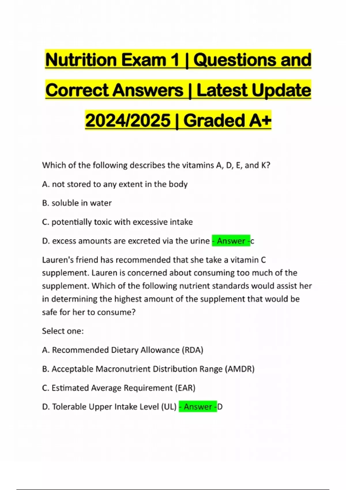 Nutrition Exam 1 | Questions and Correct Answers | Latest Update 2024/2025 | Graded A+ Which of the following describes the vitamins A, D, E, and K? A. not stored to any extent in the body B. soluble in water C. potentially toxic with excessive intake D. excess amounts are excreted via the urine - Answer -c Lauren's friend has recommended that she take a vitamin C supplement. Lauren is concerned about consuming too much of the supplement. Which of the following nutrient standards would assist her in determining the highest amount of the supplement that would be safe for her to consume? Select one: A. Recommended Dietary Allowance (RDA) B. Acceptable Macronutrient Distribution Range (AMDR) C. Estimated Average Requirement (EAR) D. Tolerable Upper Intake Level (UL) - Answer -DWhat is another name for a study of patterns of health and disease in a large population? - Answer -epidemiological study Into what two groups are vitamins classified? - Answer -fat soluble and water soluble The primary source of fuel for the body is - Answer -carbohydrates Your grandmother has recently been diagnosed with type 2 diabetes. Which of the following professionals is MOST likely to be qualified to offer your grandmother assistance in pl