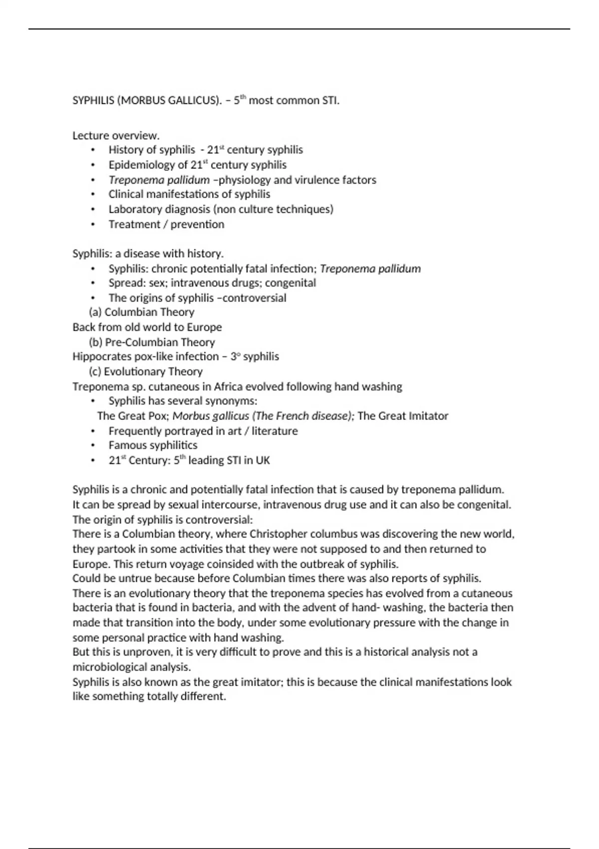 • History of syphilis - 21st century syphilis • Epidemiology of 21st century syphilis • Treponema pallidum –physiology and virulence factors • Clinical manifestations of syphilis • Laboratory diagnosis (non culture techniques) • Treatment / prevention