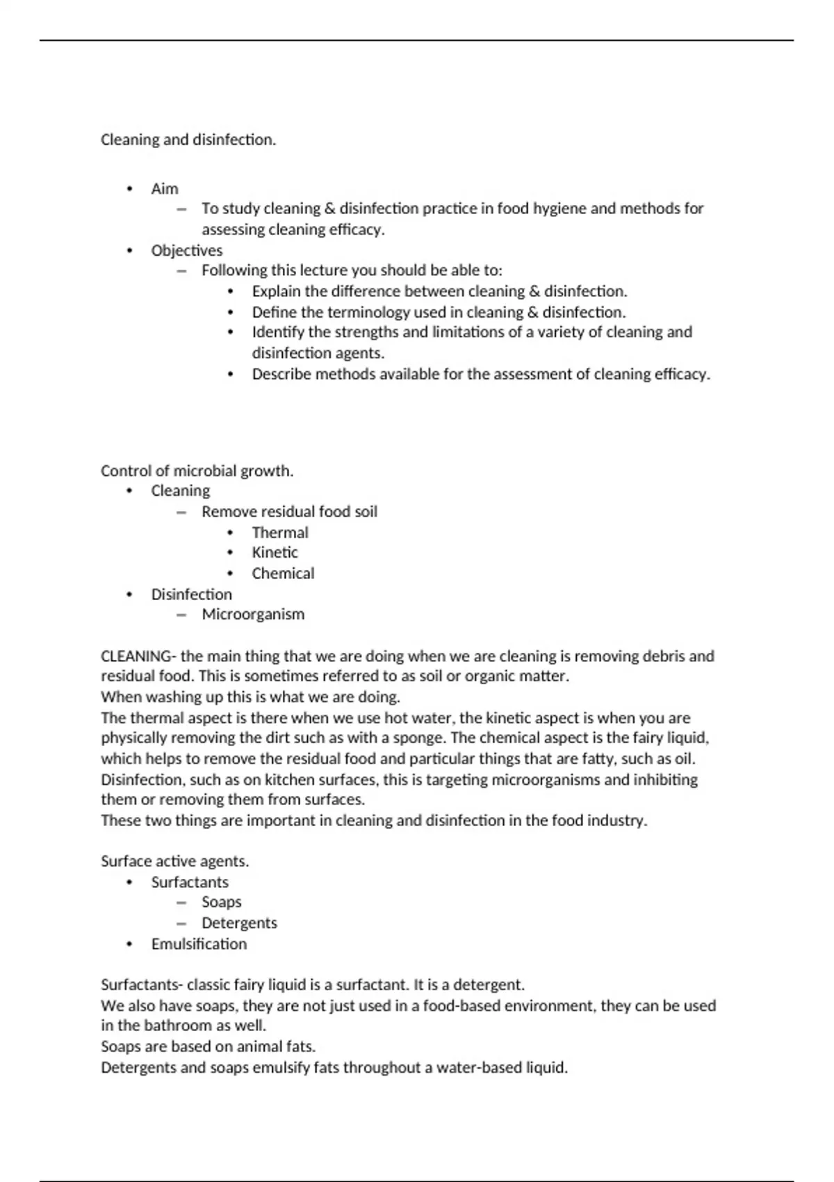 • Aim – To study cleaning & disinfection practice in food hygiene and methods for assessing cleaning efficacy. • Objectives – Following this lecture you should be able to: • Explain the difference between cleaning & disinfection. • Define the terminology used in cleaning & disinfection. • Identify the strengths and limitations of a variety of cleaning and disinfection agents. • Describe methods available for the assessment of cleaning efficacy.