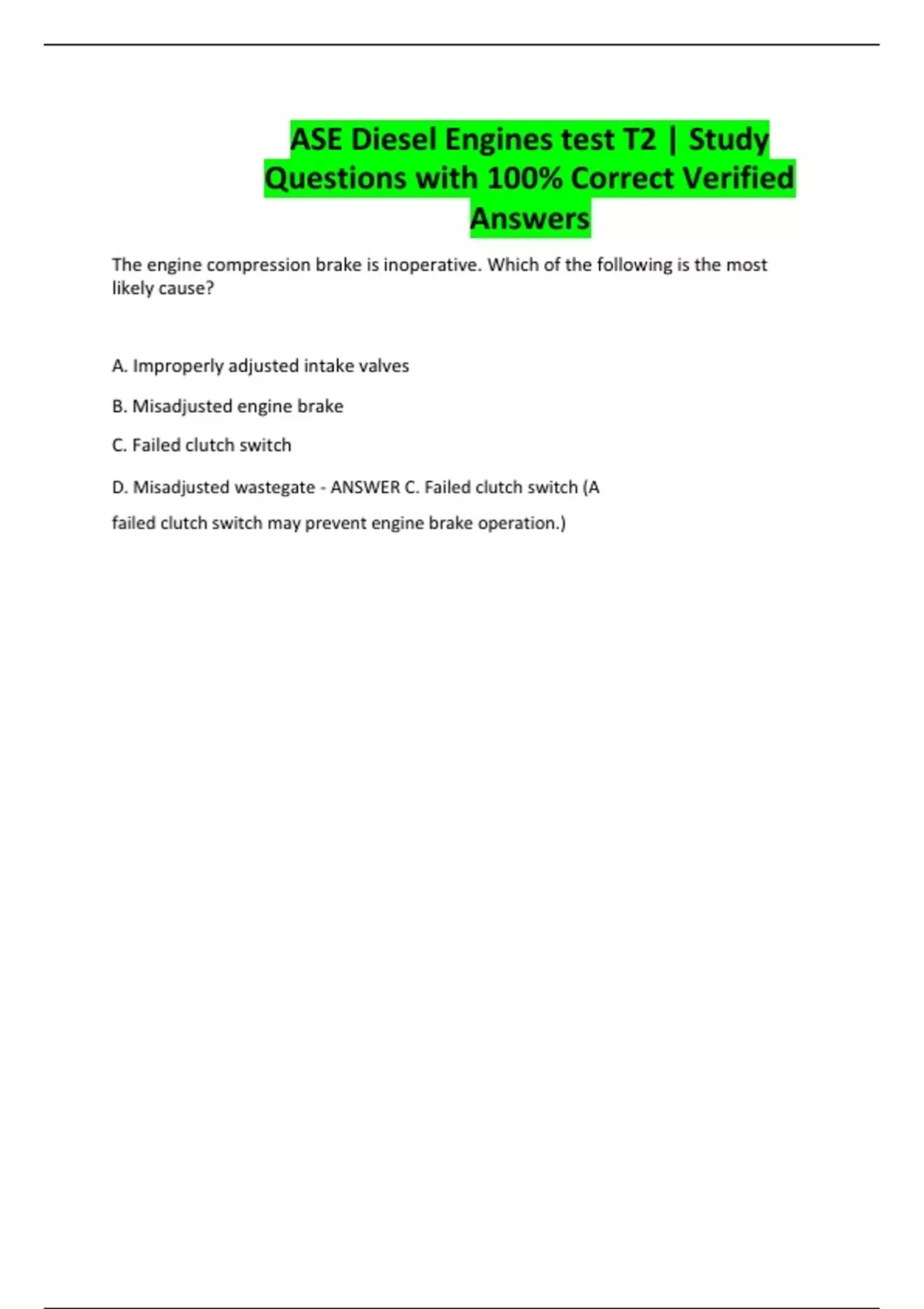 The engine compression brake is inoperative. Which of the following is the most likely cause? A. Improperly adjusted intake valves B. Misadjusted engine brake C. Failed clutch switch D. Misadjusted wastegate - ANSWER C. Failed clutch switch (A failed clutch switch may prevent engine brake operation.)