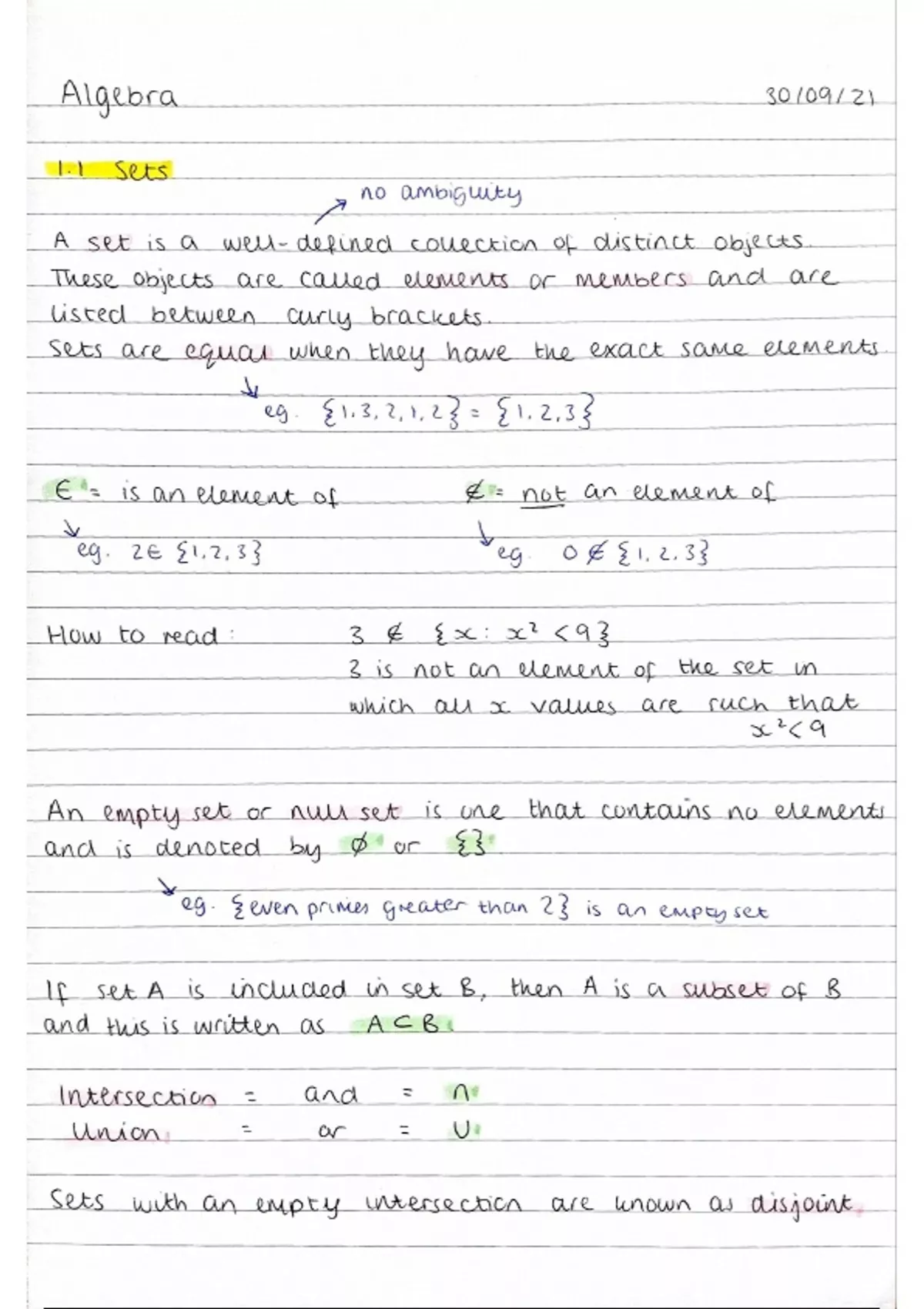 Lecture Notes for the module 'MAT1031 Algebra'. Topics covered in the notes include: - Basics such as proofs, sets, polynomials, divisibility and more - Vectors - Permutations and Cross Product - Groups and Fields Definitions in pink, formulae and equations in green, examples in blue.