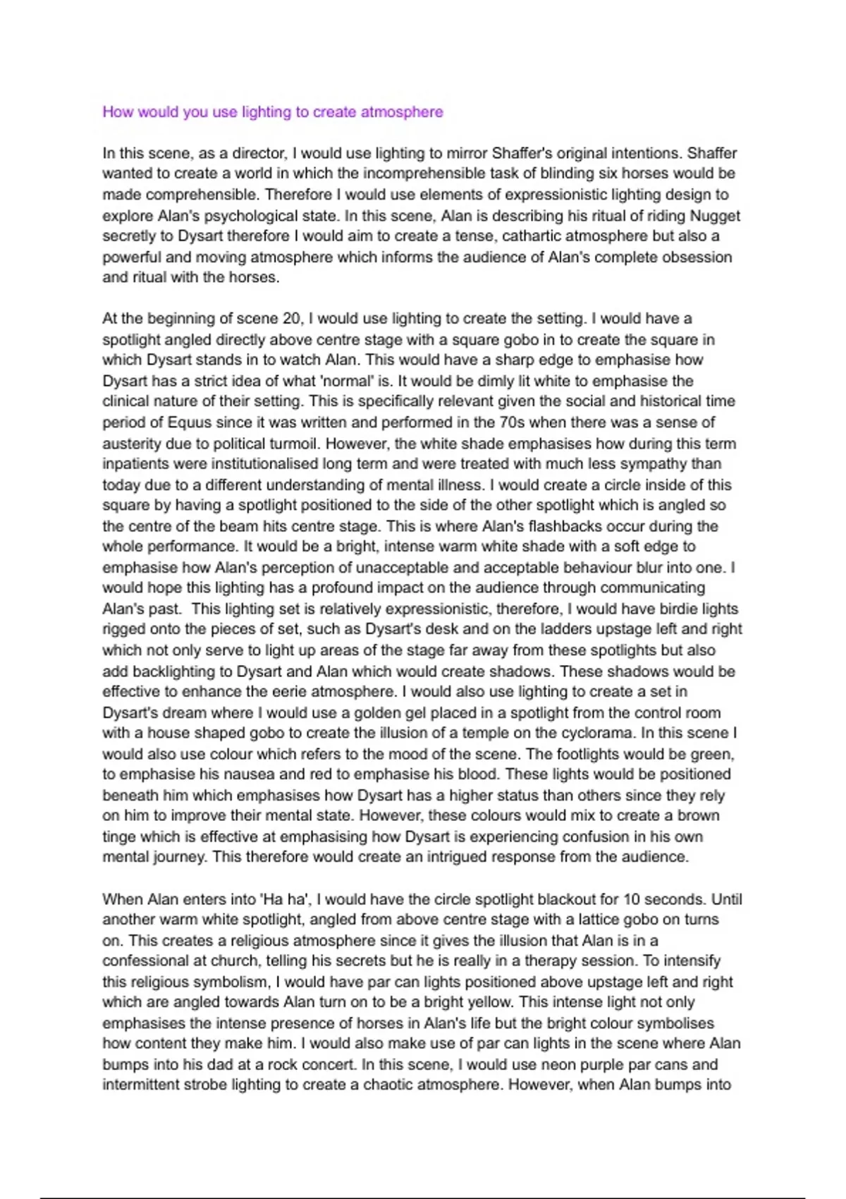 A* FULL MARKS model essay scene 21/22 lighting to create atmosphere Equus