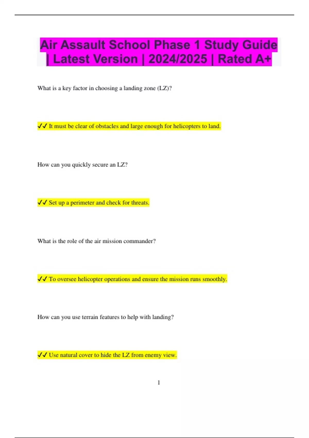 Air Assault School Phase 1 Study Guide | Latest Version | 2024/2025 | Rated A+ What is a key factor in choosing a landing zone (LZ)? It must be clear of obstacles and large enough for helicopters to land. How can you quickly secure an LZ? Set up a perimeter and check for threats. What is the role of the air mission commander? To oversee helicopter operations and ensure the mission runs smoothly. How can you use terrain features to help with landing? Use natural cover to hide the LZ from enemy view. 2 What should you do to prepare for an LZ at night? Use portable lights to make the landing area visible. How can you manage equipment efficiently during an air assault? Use collapsible containers for easy transport and storage. What is a good way to ensure clear communication during an air assault? Use secure radios and practice clear signal protocols. How can you deal with unexpected enemy resistance at the LZ? Use diversion tactics to confuse the enemy and secure the area. What is a creative way to improve safety during helicopter landings? 3 Implement landing zone markers to guide pilots safely. How can drones support an air assault
