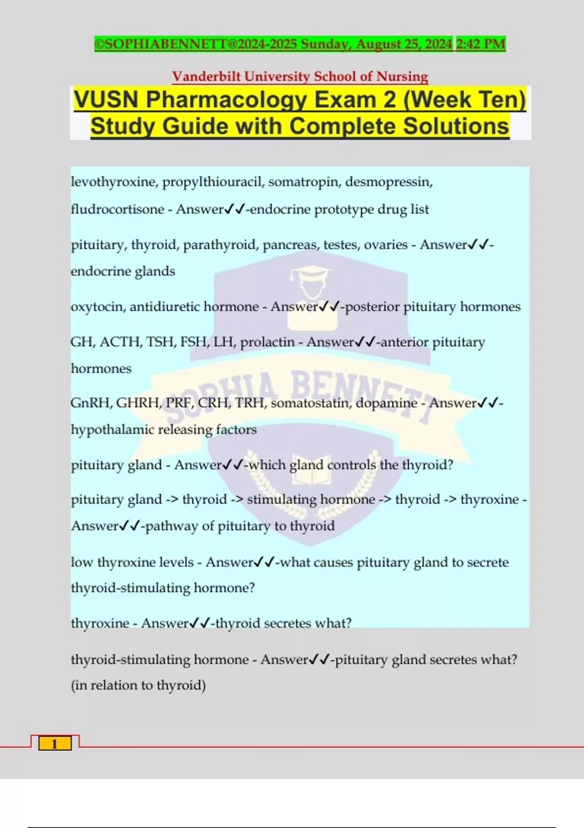 VUSN Pharmacology Exam 2 (Week Ten) Study Guide with Complete Solutions levothyroxine, propylthiouracil, somatropin, desmopressin, fludrocortisone - Answer️️ -endocrine prototype drug list pituitary, thyroid, parathyroid, pancreas, testes, ovaries - Answer️️ - endocrine glands oxytocin, antidiuretic hormone - Answer️️ -posterior pituitary hormones GH, ACTH, TSH, FSH, LH, prolactin - Answer️️ -anterior pituitary hormones GnRH, GHRH, PRF, CRH, TRH, somatostatin, dopamine - Answer️️ - hypothalamic releasing factors pituitary gland - Answer️️ -which gland controls the thyroid? pituitary gland -> thyroid -> stimulating hormone -> thyroid -> thyroxine - Answer️️ -pathway of pituitary to thyroid low thyroxine levels - Answer️️ -what causes pituitary gland to secrete thyroid-stimulating hormone? thyroxine - Answer️️ -thyroid secretes what? thyroid-stimulating hormone - Answer️️ -pituitary gland secretes what? (in relation to thyroid) ©SOPHIABENNETT@ Sunday, August 25, 2024 2:42 PM Vanderbilt University School of Nursing 2 99.5% protein bound - Answer️️ -why is metabolism of T4 so slow? T3 - Answer️️ -what is T4 converted to? hypothyroidism - Answer️️ -if thyroid is not functioning correctly it won't produce enough T4, pituitary gland will notice and keep creating excessive thyroid-stimulating hormone T4 - Answer️️ -another name for thyroxine thyroid-stimulating hormone - Answer️️ -T4 has inverse relationship with which hormone? pituitary gland - Answer️️ -in hyper and hypothyroidism, which organ is still functioning correctly? hyperthyroidism - Answer️️ -thyroid is producing excessive T4, pituitary gland notices excess and decreases production of thyroid-stimulating, leading to less production of T4 high T4, low TSH - Answer️️ -hormone levels in hyperthyroidism low T3 and T4, high TSH - Answer️️ -hormone levels in hypothyroidism free T4 - Answer️️ -measure of T4 that is not protein bound T4 thyroid function test - Answer️️ -measures total OR free levels of T4 free T4 thyroid function test - Answer️️ -only measures free T4 T3 thyroid function test - Answer️️ -measures total amount of T3 ©SOPHIABENNETT@ Sunday, August 25, 2024 2:42 PM Vanderbilt University School of Nursing 3 TSH thyroid function test - Answer️️ -measures total amount of TSH low and slow (low temp, HR, decreased LOC) - Answer️️ -phrase to remember for hypothyroidism intolerance to cold, receding hairline, hair loss, facial and eyelid edema, dull-blank expression, extreme fatigue, thigh tongue - slow speech, apathy, dry skin (coarse and scaly), muscle aches and weakness, constipation, anorexia, brittle nails and hair, menstrual disturbances - Answer️️ - symptoms of hypothyroidism subnormal temp, bradycardia, weight gain, decreased LOC, thickened skin, cardiac comlpications - Answer️️ -late clinical manifestations of hypothyroidism myxedema, cretinism - Answer️️ -significant characteristics of hypothyroidism myxedema - Answer️️ -severe thyroid deficiency tha
