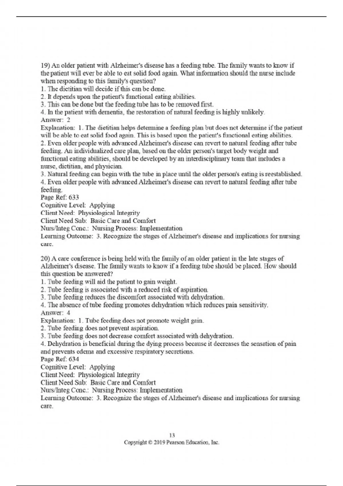 Gerontological Nursing, 4e (Tabloski) Chapter 22 The Neurologic System 1) Which assessment finding places an older patient at the greatest risk factor for the development of Alzheimer's disease? 1. Age 2. Genetic predisposition 3. Environmental exposure 4. History of previous head injury Answer: 1 Explanation: 1. Advanced age is the single greatest factor for the development of Alzheimer's disease. 2. Genetic causes are responsible for fewer than 5% of the cases of Alzheimer's disease. 3. Environmental exposure is not identified as a risk factor for the development of Alzheimer's disease. 4. History of a previous head injury is considered a medical risk for the development of Alzheimer's disease but advanced age is the single greatest risk factor for the development of the disorder. Page Ref: 619 Cognitive Level: Analyzing Client Need: Physiological Integrity Client Need Sub: Reduction of Risk Potential Nurs/Integ Conc.: Nursing Process: Assessment Learning Outcome: 2. Identify progressive dementias. 2) An older client is being evaluated for delirium. Of the following, which is not a manifestation typically used to make a diagnosis of this disorder? 1. Unable to physically swallow when asked to 2. Unable to remember who visited earlier in the day 3. Unable to sleep at night, but able to sleep through the day 4. Unable to maintain attention Answer: 1 Explanation: 1. Delirium is a disturbance in mental abilities. The physical ability of swallowing is not affected by delirium. 2. Short-term memory impairment such as being unable to remember who visited earlier in the day is a symptom of delirium. 3. Sleep-wake cycle disturbance, such as being able to sleep through the day but not at night, is a symptom of delirium. 4. Not being able to maintain attention is an impairment that is a symptom of delirium. Page Ref: 589 Cognitive Level: Analyzing Client Need: Physiological Integrity Client Need Sub: Physiological Adaptation Nurs/Integ Conc.: Nursing Process: Implementation Learning Outcome: 2. Identify progressive dementias and other neurologic illnesses such as Parkinson's disease. 1 Copyright © 2019 Pearson Education, Inc. 3) An older patient newly diagnosed with Alzheimer's disease is prescribed galantamine (Razadyne). How will the nurse instruct the patient about this medication? Select all that apply. 1. Take at bedtime. 2. Take the medication with food. 3. The dosage may be changed every 4 weeks. 4. Side effects of this medication are minimal. 5. Do not take the medication with an NSAID. Answer: 2, 3, 5 Explanation: 1. This medication is not specifically to be given at bedtime. 2. This medication can cause gastrointestinal upset and should be taken with food. 3. This medication is titrated at 4-week intervals. The dosage may be changed every 4 weeks. 4. The side effects of this medication include gastrointestinal upset and bleeding, arrhythmias, urinary obstruction, somnolence, tremor, abdominal pain, and rhinitis. 5. This medication should be used with caution if also prescribed NSAIDs since this could increase the risk of gastrointestinal bleeding. Page Ref: 622 Cognitive Level: Applying Client Need: Physiological Integrity Client Need Sub: Pharmacological and Parenteral Therapies Nurs/Integ Conc.: Nursing Process: Implementation Learning Outcome: 4. Apply a contextual model to direct behavioral and pharmacological interventions for behavioral symptoms of Alzheimer's disease. 4) An older client is diagnosed with dementia caused by Lewy bodies. What will the nurse most likely assess in this client? Select all that apply. 1. Tremor 2. Rigidity 3. Postural instability 4. Sleep apnea 5. Visual hallucinations Answer: 1, 2, 3, 5 Explanation: 1. Clinical symptoms of dementia caused by Lewy bodies include a tremor. 2. Clinical symptoms of dementia caused by Lewy bodies include rigidity. 3. Clinical symptoms of dementia caused by Lewy bodies include postural instability. 4. Sleep apnea is not a clinical symptom of dementia caused by Lewy bodies. 5. Clinical symptoms of dementia caused by Lewy bodies include visual hallucinations. Page Ref: 618 Cognitive Level: Applying Client Need: Physiological Integrity Client Need Sub: Physiological Adaptation Nurs/Integ Conc.: Nursing Process: Assessment Learning Outcome: 2. Identify progressive dementias. 2 Copyright © 2019 Pearson Education, Inc. 5) An older patient is diagnosed with early-mild Alzheimer's disease. Which should be done at the time of diagnosis? 1. Discuss treatment options and wishes with the patient. 2. Identify a long-term care facility for immediate transfer. 3. Explain that this stage of the disorder can last up to 10 years. 4. Instruct family members to slowly improve the home environment for safety. Answer: 1 Explanation: 1. Early diagnosis provides the family and the older person with the opportunity to discuss treatment options and wishes while the older person still has decision-making capacity. 2. It is not necessary to identify a long-term care facility for the older patient at this stage of the disorder. 3. There is no specific time interval for early-mild Alzheimer's disease. 4. The family should prepare the home to avoid safety issues as soon as possible. Page Ref: 622 Cognitive Level: Applying Client Need: Physiological Integrity Client Need Sub: Reduction of Risk Potential Nurs/Integ Conc.: Nursing Process: Implementation Learning Outcome: 3. Recognize the stages of Alzheimer's disease and implications for nursing care.