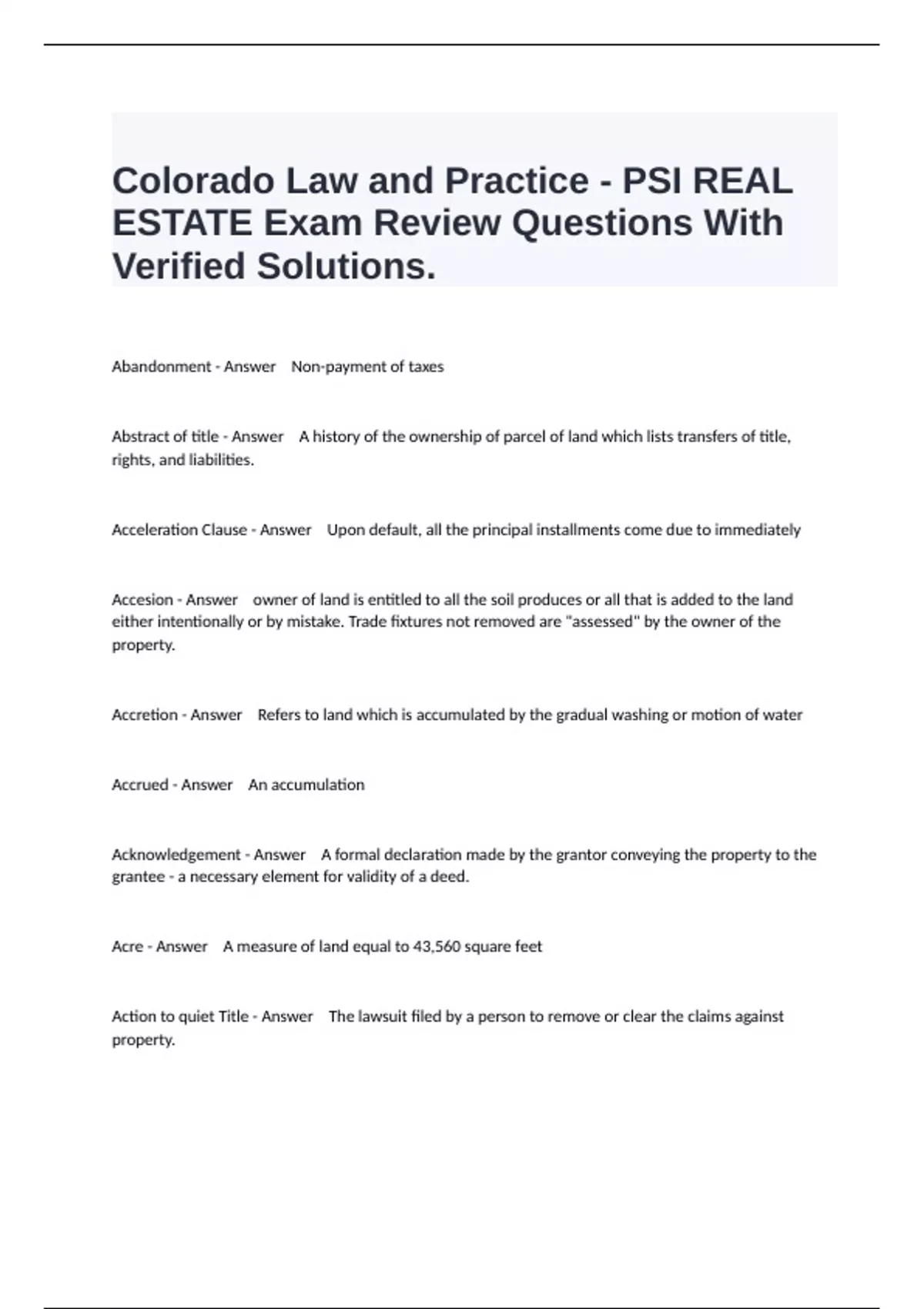 Abstract of title - Answer A history of the ownership of parcel of land which lists transfers of title,
