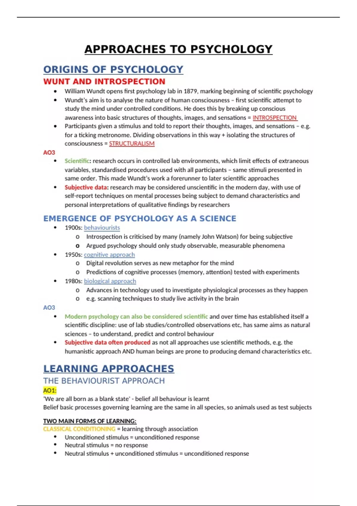 This document contains AQA psychology approaches notes including clear AO1 points and a range of AO3 (evaluation) points.