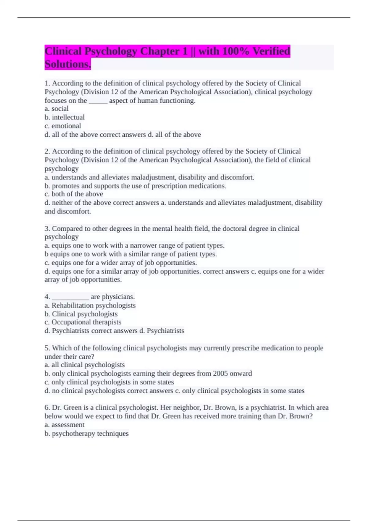 1. According to the definition of clinical psychology offered by the Society of Clinical