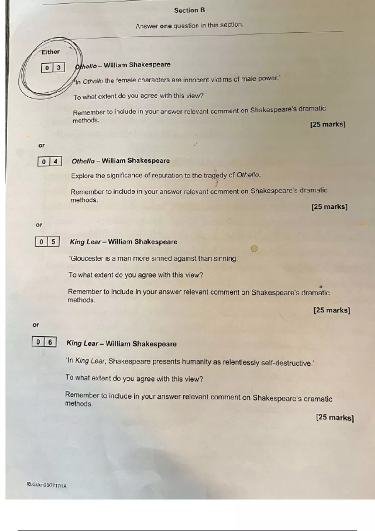 A* full mark section B essay Othello English Literature B