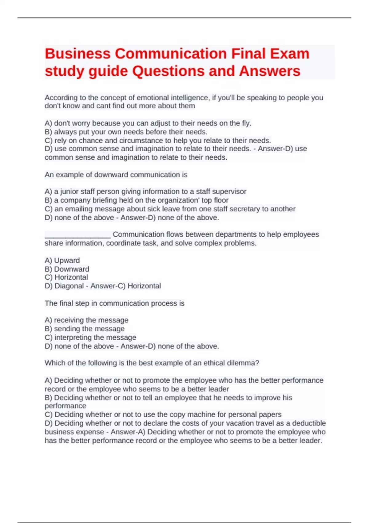 According to the concept of emotional intelligence, if you'll be speaking to people you don't know and cant find out more about them A) don't worry because you can adjust to their needs on the fly. B) always put your own needs before their needs. C) rely on chance and circumstance to help you relate to their needs. D) use common sense and imagination to relate to their needs. - Answer-D) use common sense and imagination to relate to their needs. An example of downward communication is A) a junior staff person giving information to a staff supervisor B) a company briefing held on the organization' top floor C) an emailing message about sick leave from one staff secretary to another D) none of the above - Answer-D) none of the above. ________________ Communication flows between departments to help employees share information, coordinate task, and solve complex problems. A) Upward B) Downward C) Horizontal D) Diagonal - Answer-C) Horizontal The final step in communication process is A) receiving the message B) sending the message C) interpreting the message D) none of the above - Answer-D) none of the above. Which of the following is the best example of an ethical dilemma? A) Deciding whether or not to promote the employee who has the better performance record or the employee who seems to be a better leader B) Deciding whether or not to tell an employee that he needs to improve his performance C) Deciding whether or not to use the copy machine for personal papers D) Deciding whether or not to declare the costs of your vacation travel as a deductible business expense - Answer-A) Deciding whether or not to promote the employee who has the better performance record or the employee who seems to be a better leader.